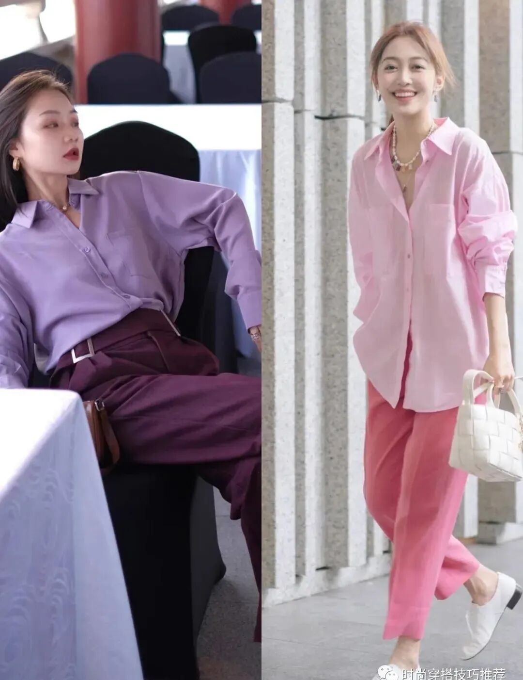夏天有这么多流行的颜色,你不能总是穿基本的颜色,除了基本的颜色,流行的颜色也可以安排,如粉色,紫色这些女性的颜色,穿在身上也可以进一步展示你的魅力,像这些紫色衬衫和紫色裤子,粉色衬衫和粉色宽腿裤,可以改善模特的亮点哦。