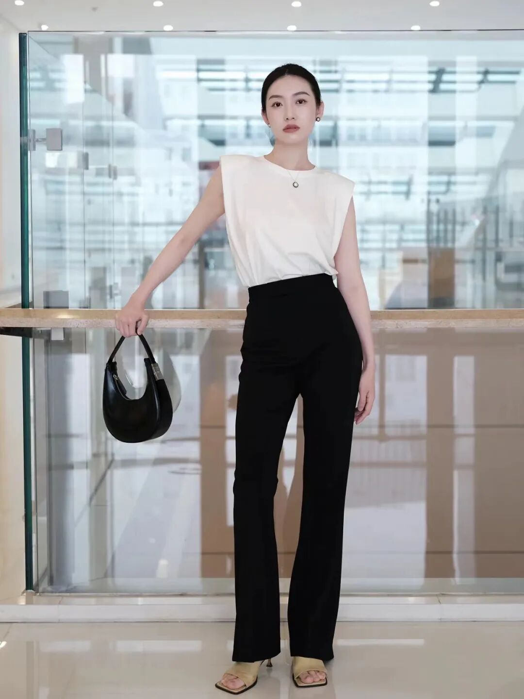 不过,要特别注意颜色的比例,身材匀称协调的姐妹可以大胆尝试55分的黑白。