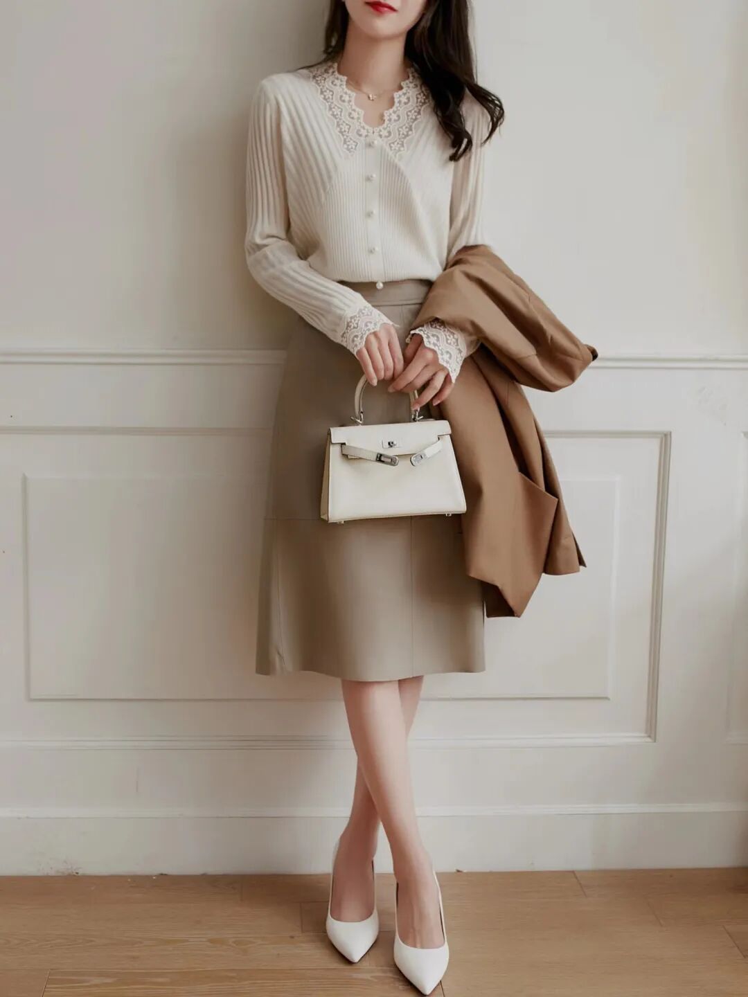 蕾丝的轻薄和毛衣的厚实让整个身体看起来非常轻盈活泼。这种设计风格很常见。衣领和角落的蕾丝元素似乎是翩翩起舞的蝴蝶,给厚毛衣带来了不同的美感。
