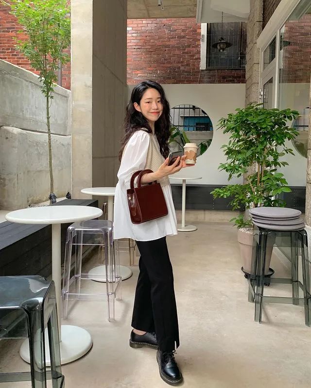 衬衫+阔腿裤搭配小皮鞋,再拎一个复古方包,秒变温柔韩系小姐姐。