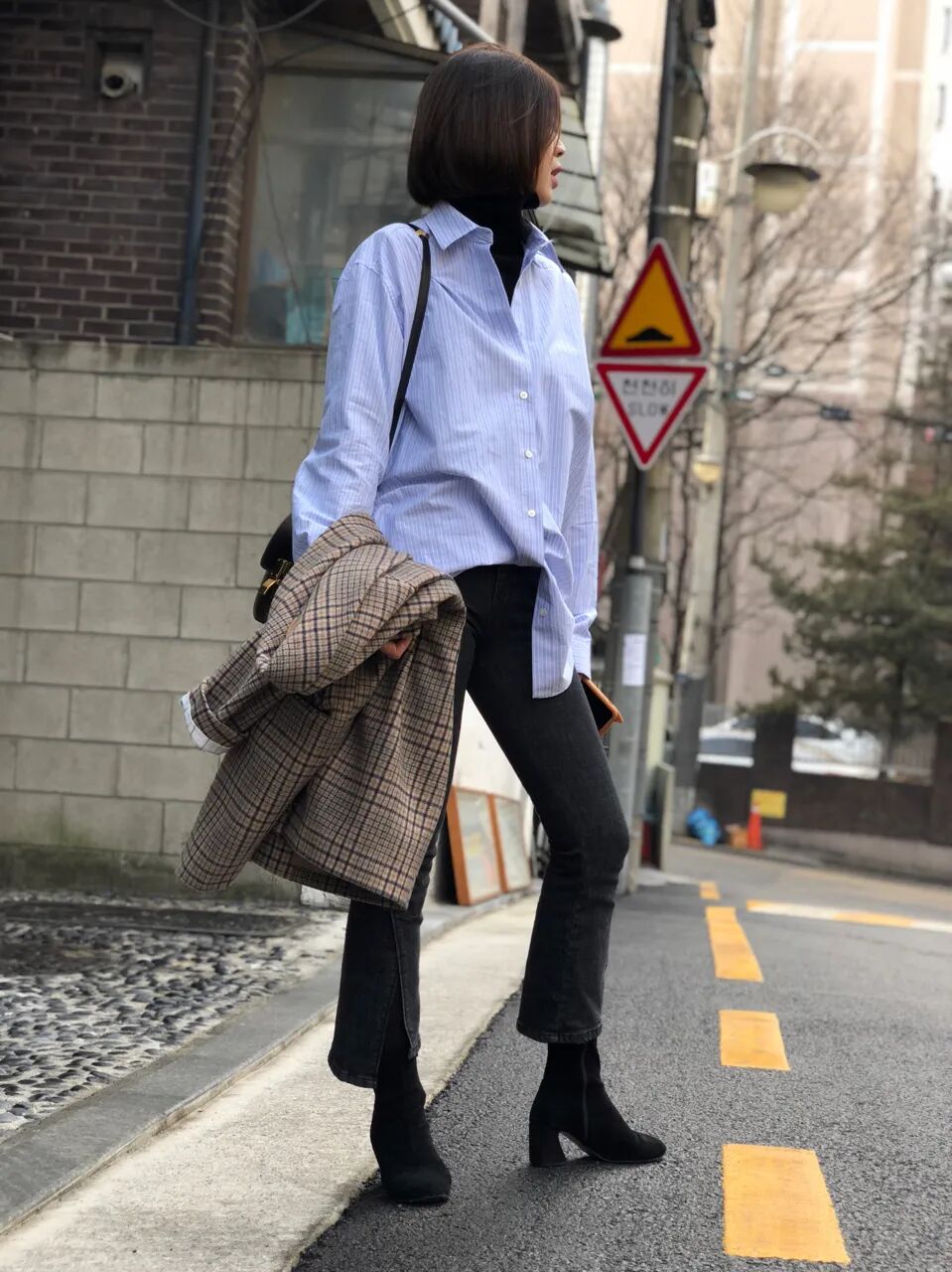 搭配直筒开叉裙,略显成熟,适合40岁左右的女性。如果整体颜色比较暗,可以搭配一点亮色,成熟却能展现个人魅力。也可以选择外套和裙子,也就是说,腰部外套更装饰身材曲线,比如博主的深蓝色和一些金属装饰版本。虽然整体颜色很暗,但V字开口适当露出颈线,丝巾非常优雅。任何年龄都可以穿裸靴,30岁+女性可以搭配百褶裙和西装,这种深咖啡色的百褶裙,选择白色裸靴,用色彩和谐的方式,让穿着更有质感。Look非常适合上班族,其实这种穿法也没有太多的年龄限制,40岁也能穿得很有魅力。喜欢复古风格的女性可以选择小香风外套+牛仔裤搭配裸靴,牛仔裤只适合直筒版,太宽太紧效果不是很好。适当放松,穿起来会更时尚。此外,小香风也可以多样化,清新甜美的蕾丝衬衫或针织。拼色裸靴搭配要注意,颜色不要太花哨,两色拼接好,还要看搭配,配色对我们普通人来说,也很重要,颜色呼应是最好的方式。靴子和一点鞋跟实际上是最能控制各种形状的,即使鞋跟不是很高,也能在视觉上显得更光环,加上皮革的材料因素,有点酷的感觉很时尚。特别是露腿穿,这种靴子使用最多,展示腿也可以搭配一双保暖的丝袜。秋天,很多人喜欢穿百褶裙,搭配短鞋,觉得露腿太多,显冷!靴子是最好的选择。这种靴子,不管腿型好不好,包裹小腿后,整体视觉都会比全腿好看。搭配短裙,短裤很年轻。与此同时,靴子也很帅气,有收紧的筒围,有宽松的筒围可供选择,这两种都是根据自己的风格来选择的Pick,最近流行的大女人风格可以选择鞋跟稍高的靴子,穿起来又酷又漂亮。同时,这种靴子搭配裙子也是一无二的。不想露腿的姐妹可以这样搭配。如果担心厚重,上身的衣服可以更薄,也可以换成更轻的裙子,然后搭配外套或者厚重的衣服,就没那么臃肿了!厚底靴可以说是活的C位,很多明星和时尚博主都很喜欢。厚底靴的厚底设计增加了运动鞋的舒适性,也增加了高跟鞋的视觉效果。关键是它们也很减龄,它们的厚重感会给人一种很好的感觉“力量”的感觉。这种鞋子的搭配也很简单。小个子可以选择短靴的款式,视觉上压身高。可以搭配外套、短裙和直筒牛仔裤。