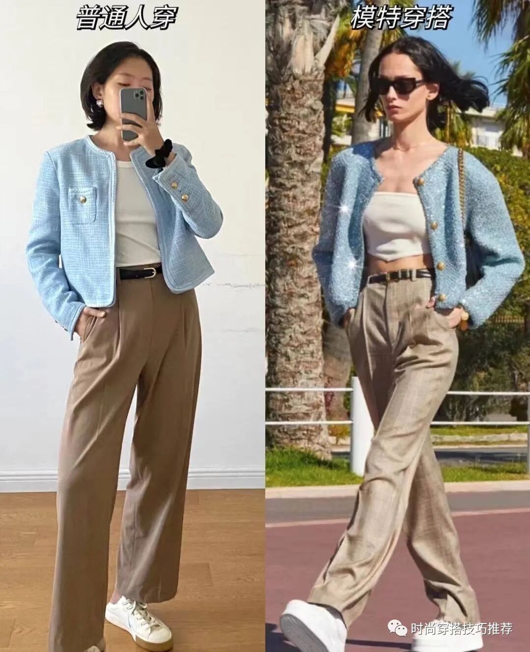 说到最不能错过的大地色系下装,一定要提卡其裤。卡其色阔腿裤。.卡其色直筒裤或卡其色花蕾裤,非常适合普通大众,职场,.出街.每天都可以穿。卡其裤搭配白衬衫简约知性,卡其裤搭配黑色奶奶衬衫.西装或粗花呢外套,也很成熟优雅。我们也可以向博主学习,用蓝色粗花呢外套搭配卡其裤.小白鞋,普通人很容易拉近与博主的距离!二、学习大地色配色思路