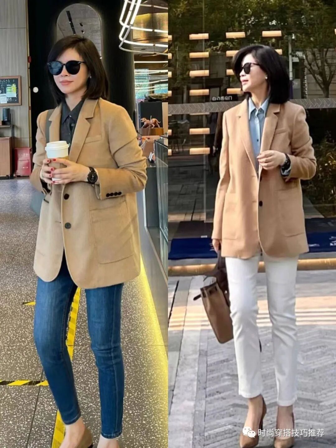 秋天一定要有一些大地色单品是西装,尤其是牛奶驼色西装,很有氛围感,百搭实用优雅知性,适合任何年龄段的人,容易凸显好气质。牛奶驼色西装可以创造多种形状,如博主用牛奶驼色西装搭配小脚牛仔裤,裤子可以选择蓝色或白色,统一鞋子和西装的颜色,首尾呼应太精致!