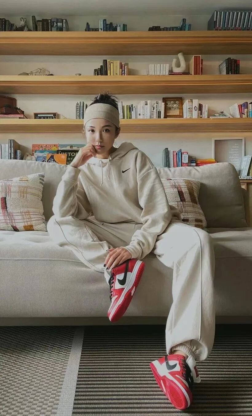 还可以利用秋季的其他单品,增加整体搭配细节,一整个“你看起来很容易穿”既视感!卫衣+卫裤是塑造性很强的组合,也是近两年大火的组合Athflow风的代表搭配,不需要费脑子的时尚搭配。同色系的卫衣裤是最不容易出错的选择,黑白灰是入门级必备!更进阶一些的穿法就是选择更出挑的颜色,或者搭配一些亮色单品,增加整体搭配的抢眼点!