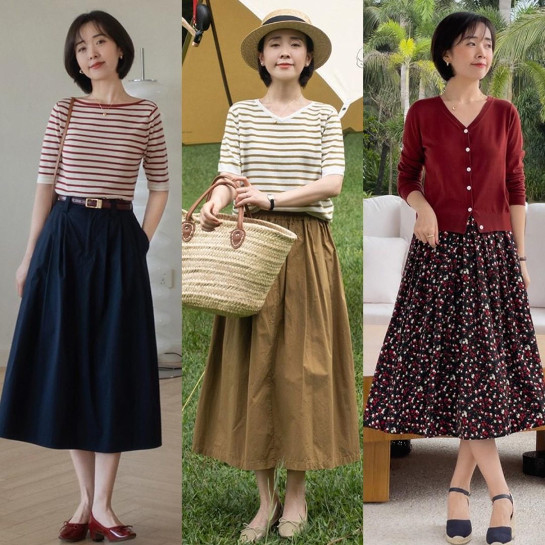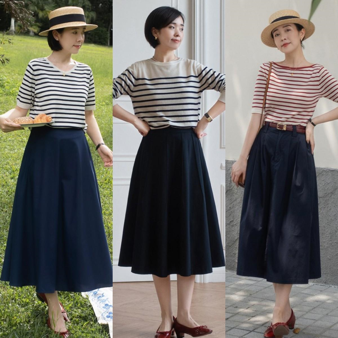 条纹元素套头针织长袖或针织短袖,搭配纯色高腰伞裙,宽裙突然增添优雅感,特别迷人。