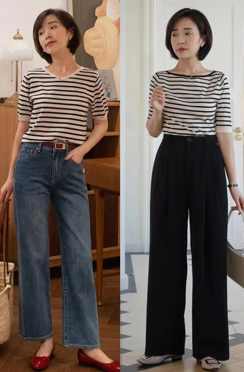 如果觉得纯色针织衫略显单调,可以选择黑白条纹元素的针织衫,再搭配高腰阔腿裤来展现身材比例。同时,阔腿裤对腿非常包容。