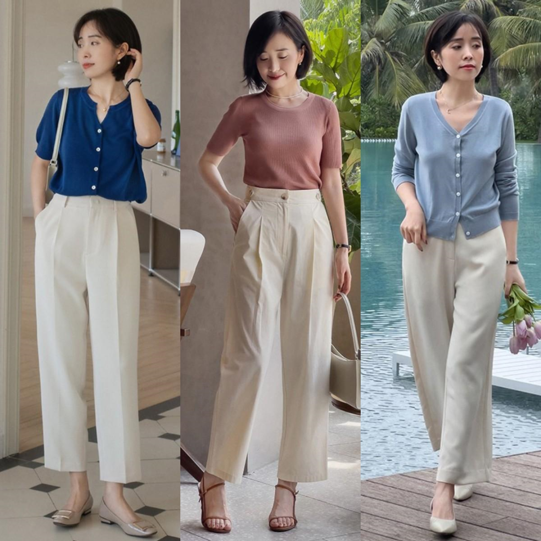 并不是每个成熟的女性腹部都有脂肪,但就像胯部比较宽一样,选择这种白色高腰西装直筒裤,宽松的裤脚可以掩盖腿部缺陷,上半身可以选择温和的粉色或雾蓝色针织衫,甚至像宝蓝色。