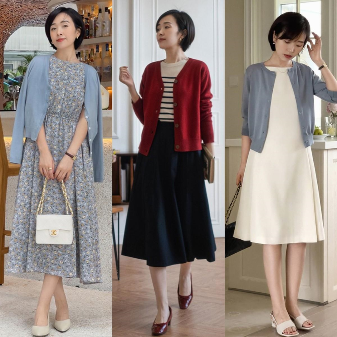 35+女性平时穿的时候也很注重自己是否年轻,所以也可以在穿的时候融入一些减龄的时尚元素。就像穿碎花元素,比如碎花连衣裙外面穿蓝色针织开衫,看起来既洋气又年轻。