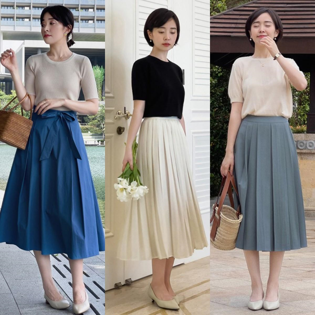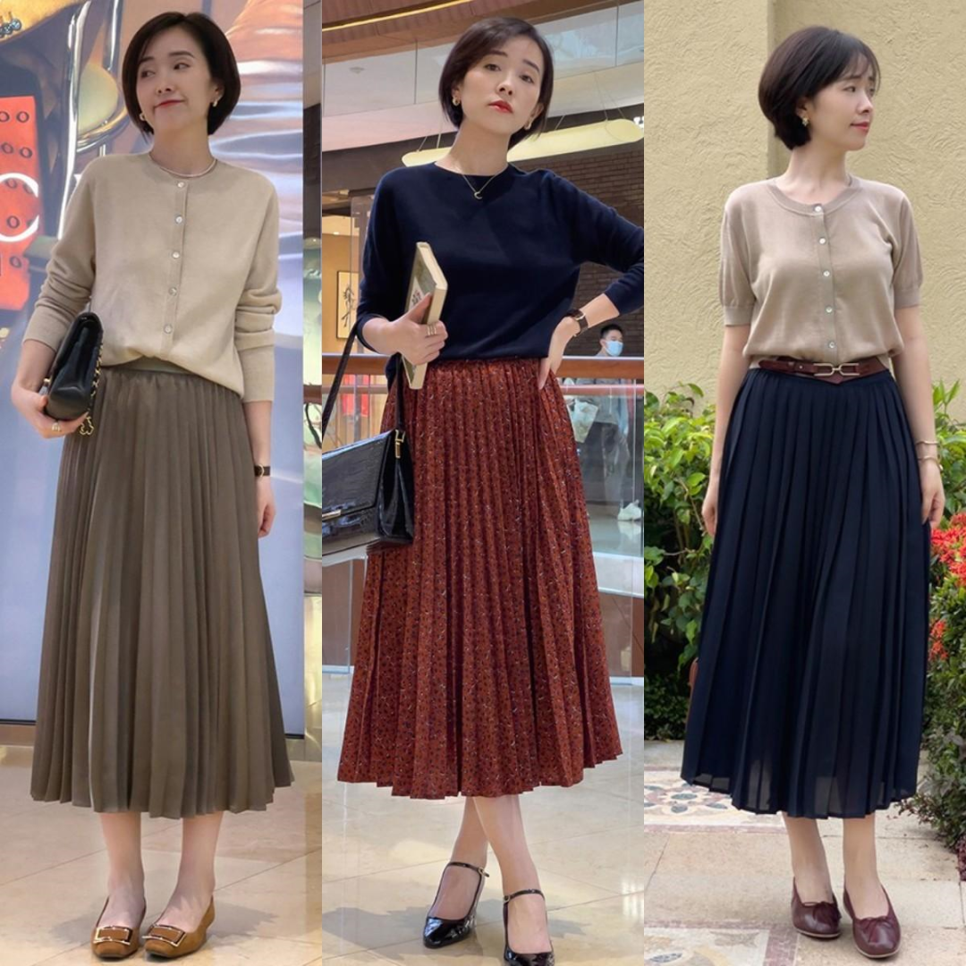 半裙一直给人一种端庄大气的气质。初秋选择百褶裙搭配纯色针织衫,视觉上不会有耀眼的感觉。