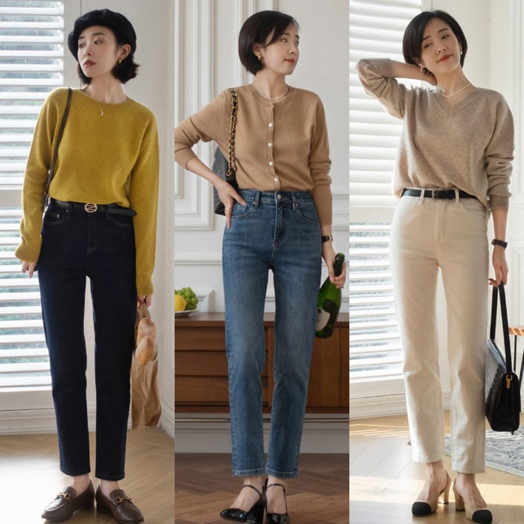 紧身裤比较挑腿型,对于我们大多数人来说,选择宽松的直筒高腰裤比较实用。同时,像九的设计可以露出纤细的脚踝,拉长腿部。上身搭配针织衫,将上衣全部塞入裤子中,区分腰线,不仅穿着舒适,而且身材比例更好。