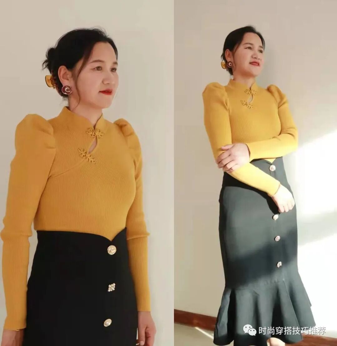 除了在图案上下功夫,一些设计师更喜欢在细节和版本上展现自己的个性。图中的姜黄色毛衣有两个独特的设计。一是泡泡袖设计,增强肩部立体感,二是旗袍扣设计,使整体更具古典魅力。搭配鱼尾裙,可以突出纤细的腰身,裙子可以与泡泡袖相对应,避免头重脚轻的问题。三、外套+半身裙