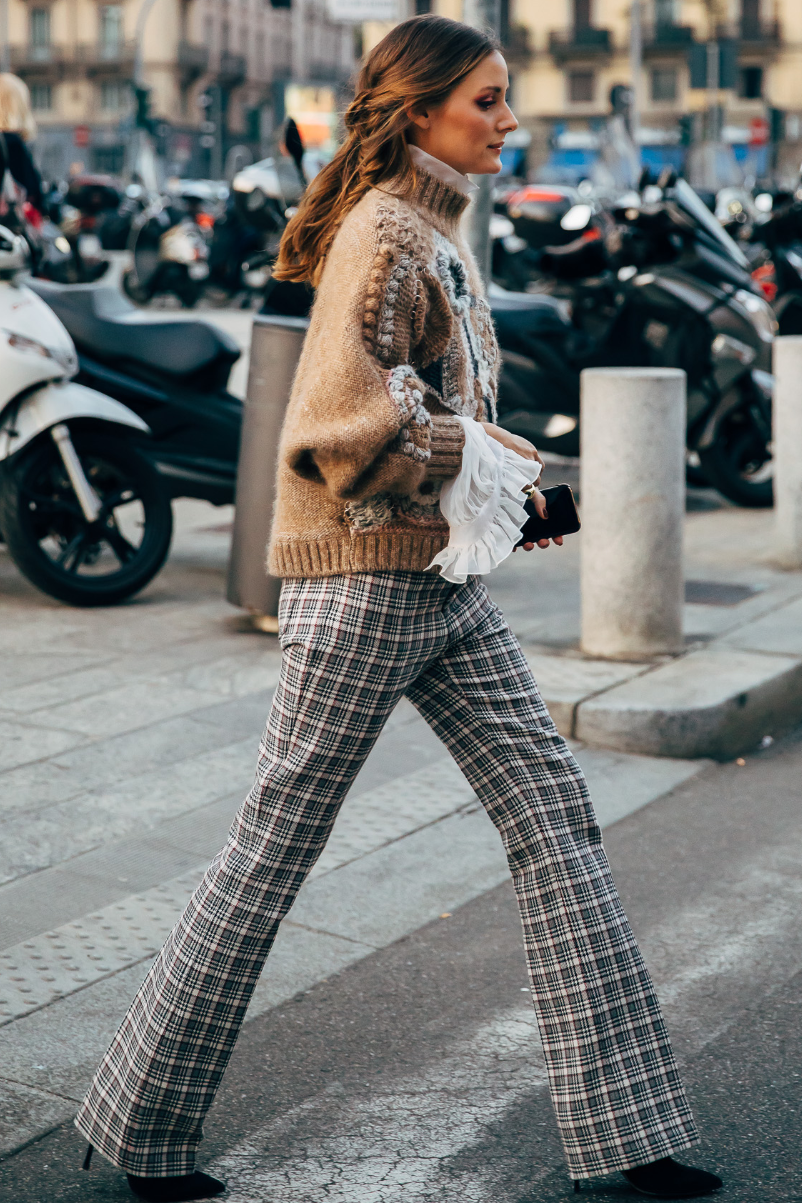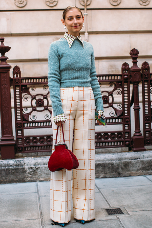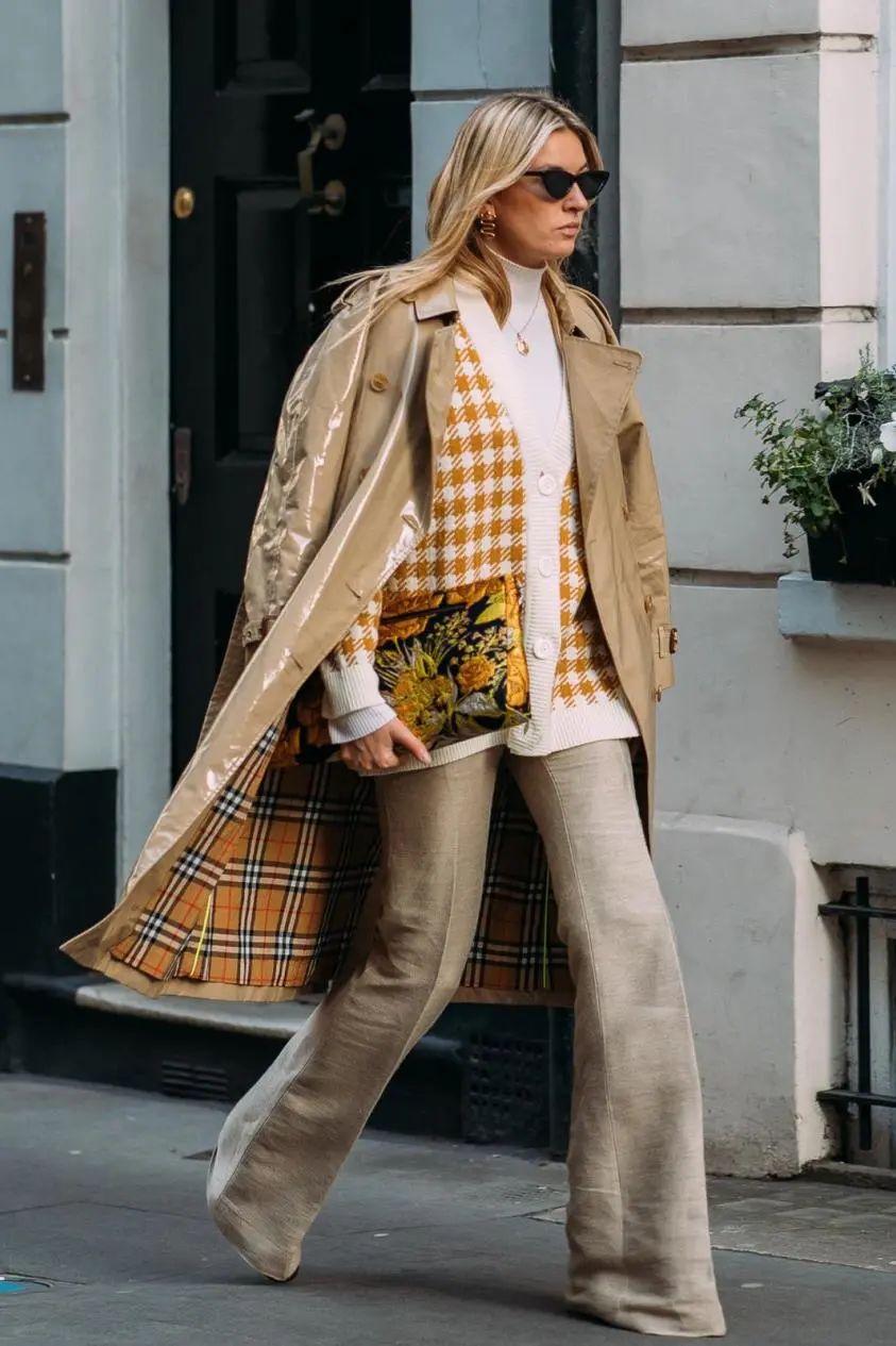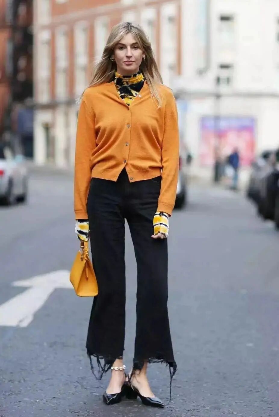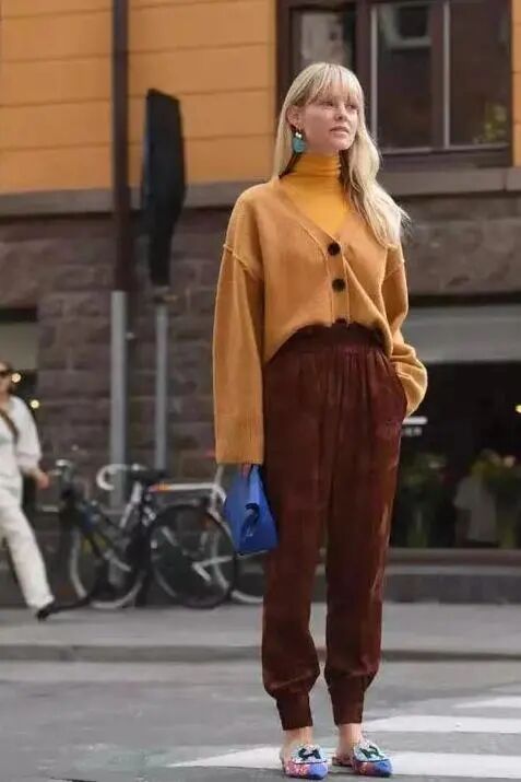 为了避免两种针织造成的臃肿感,外面的毛衣领口可以发生一些变化,V衣领、扣子都有突出层次的功能,即使穿同色系也不会糊成一团。