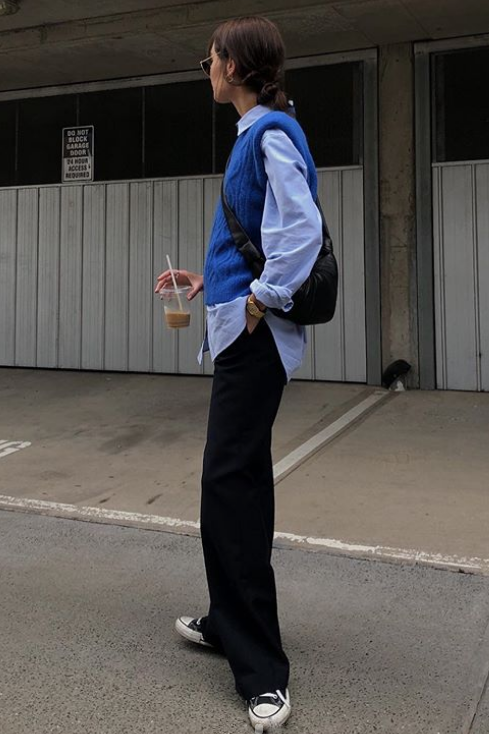 针织背心不仅充满了复古的气质,而且有一种优雅的气质。在日常穿着中,尽量选择宽松的衬衫,以慵懒的感觉平衡针织背心的克制感。