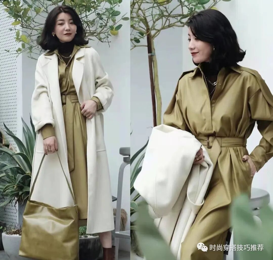 这件白色外套可以在视觉上改善人的肤色,使肤色更有光泽。它使用的版本比较宽松,可以掩盖身体的一些缺点,也可以折叠其他上衣。比如这位女士在外套里加了一件鳄梨风衣,营造出清新的氛围感。搭配同色腰带,面料可以在一定程度上紧绷,看起来更整洁。