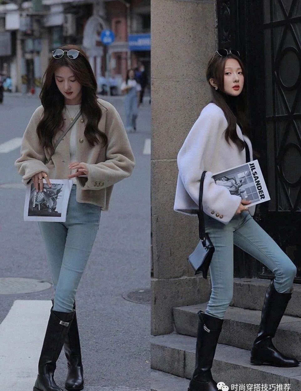 下面的浅蓝色紧身牛仔裤非常时尚,展现气质,对身材的装饰效果也特别好。通过时尚的蓝色牛仔裤搭配黑色靴子,可以轻松反映长腿。再加上短外套,看起来也很高很瘦,适合小个子。