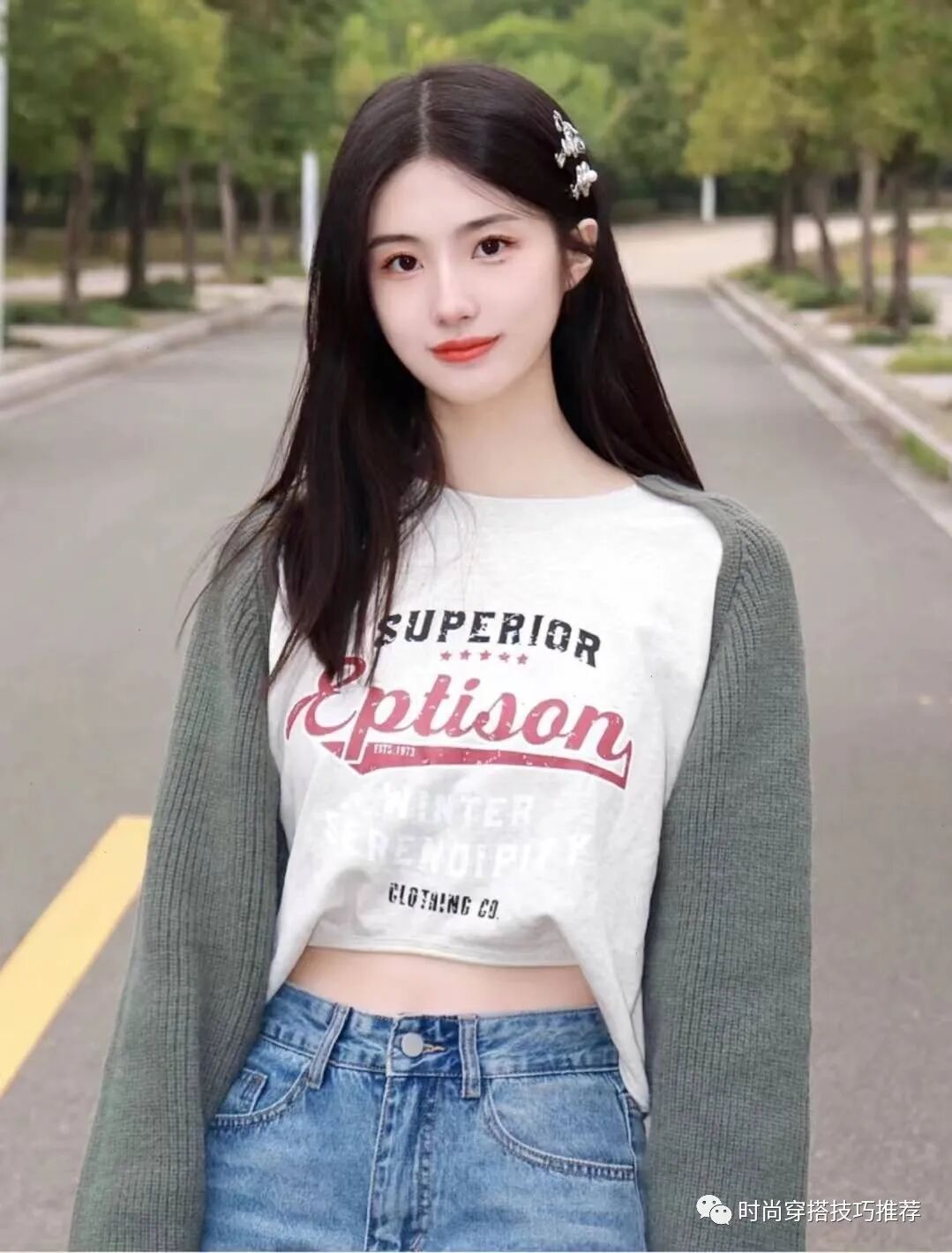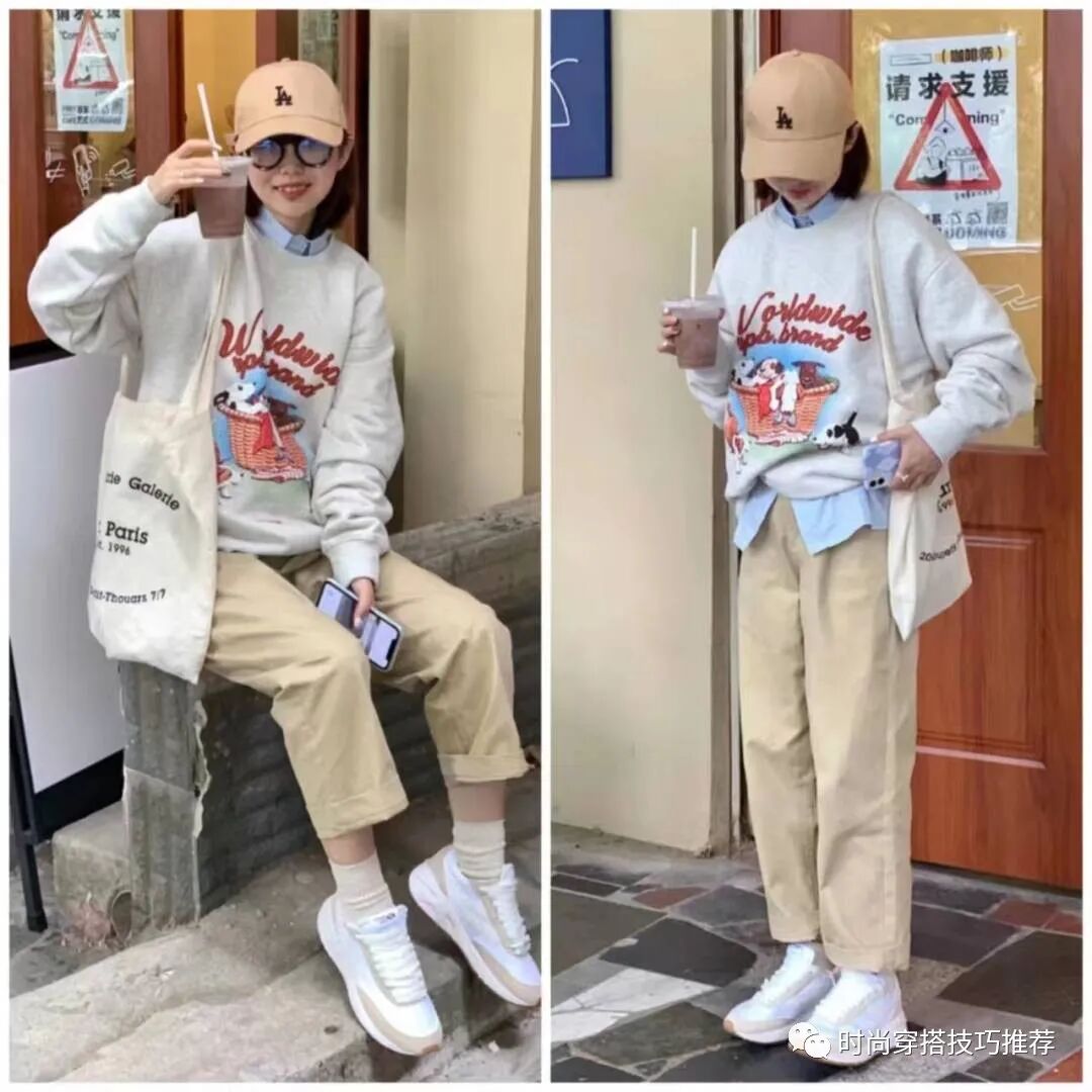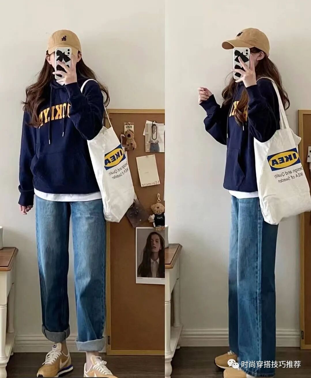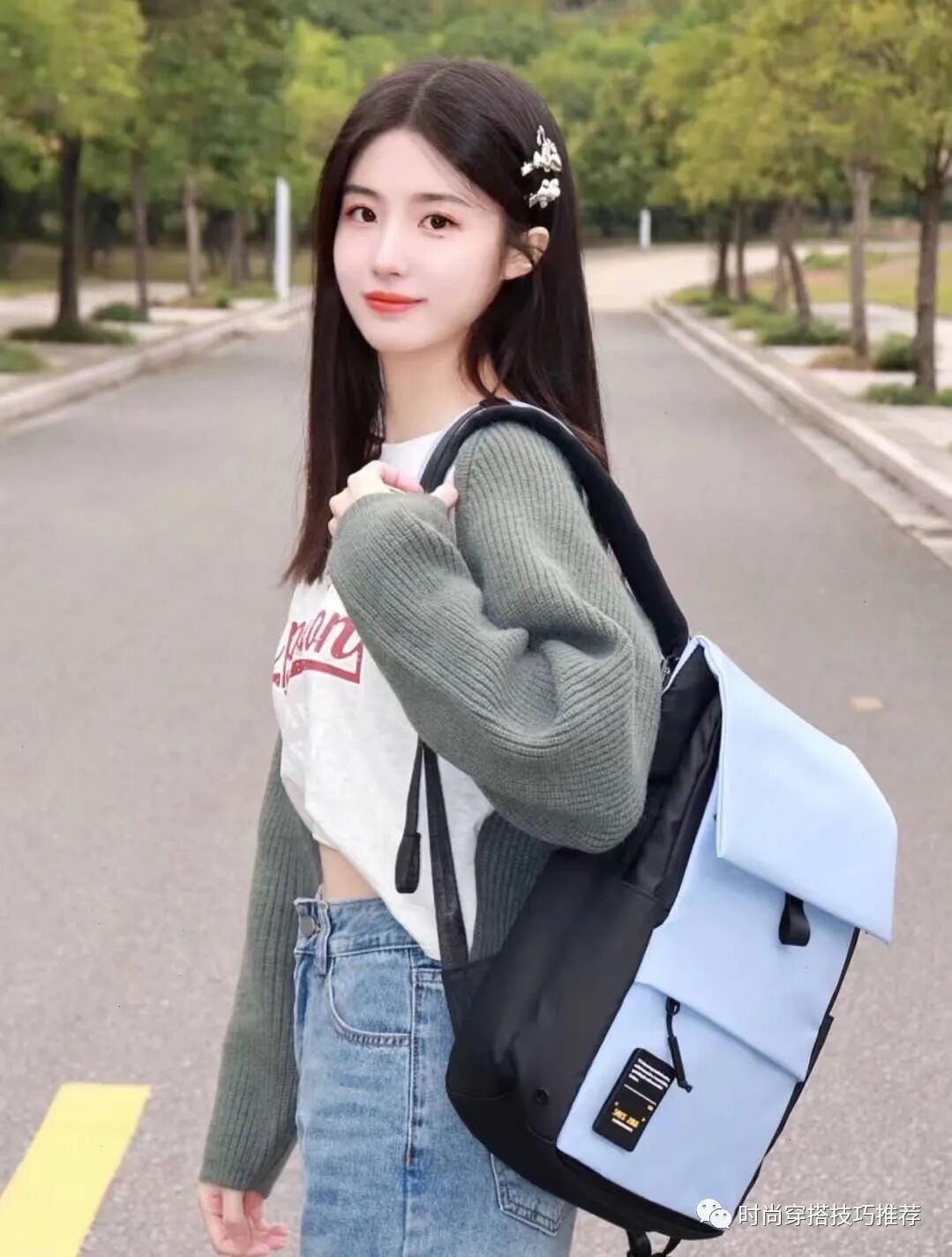 校园风的一套搭配:喜欢一些休闲舒适的穿搭,短款卫衣hin显比例,春天搭配浅色牛仔裤,校园风离不开双肩包,一套元气满满,减龄至少10岁。