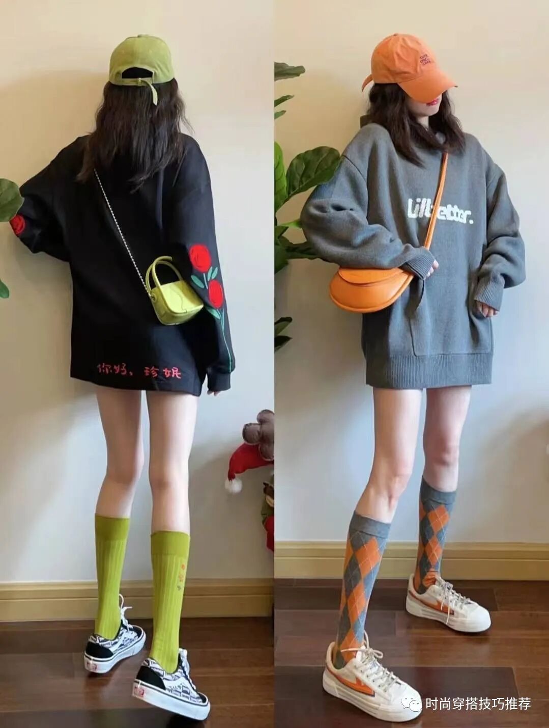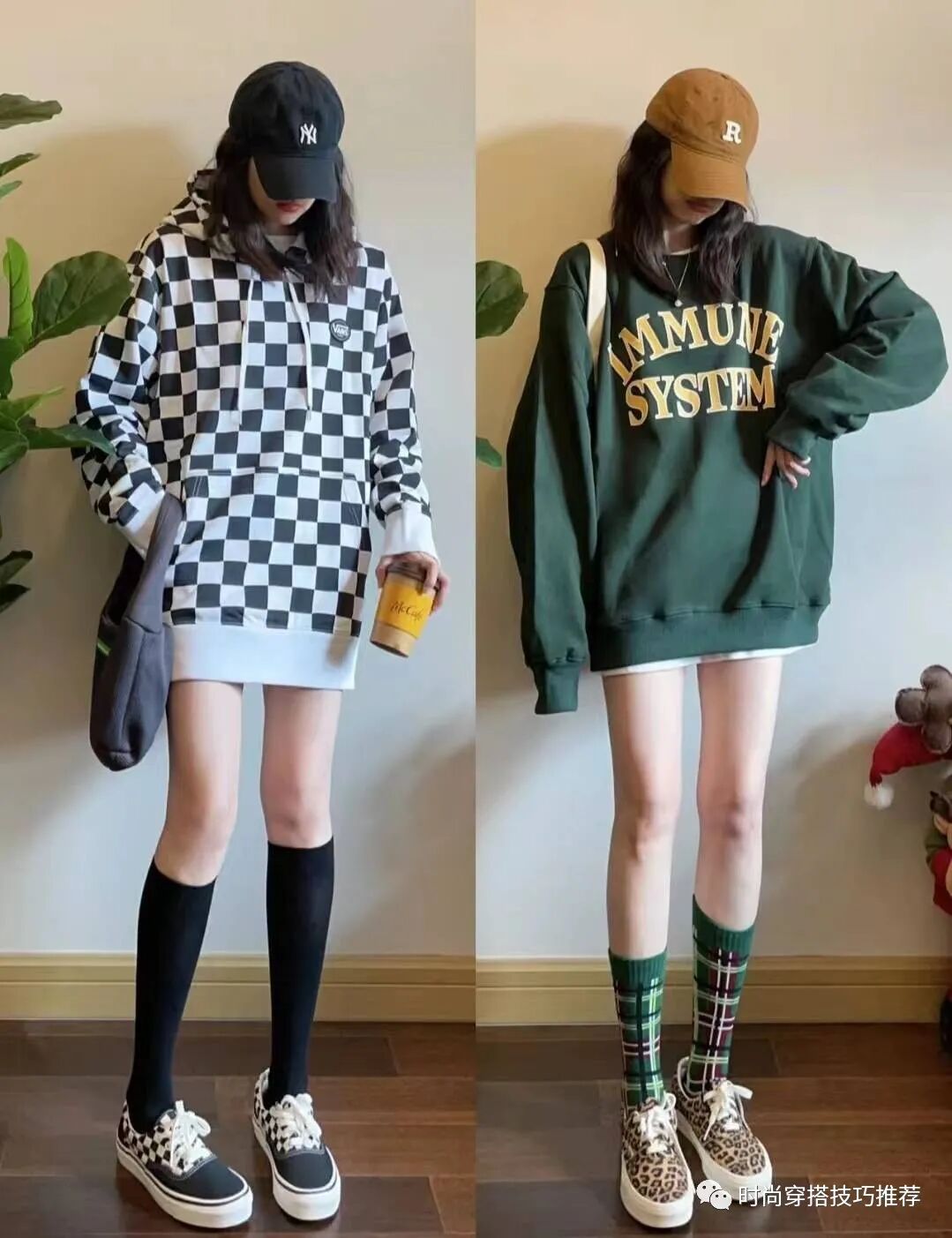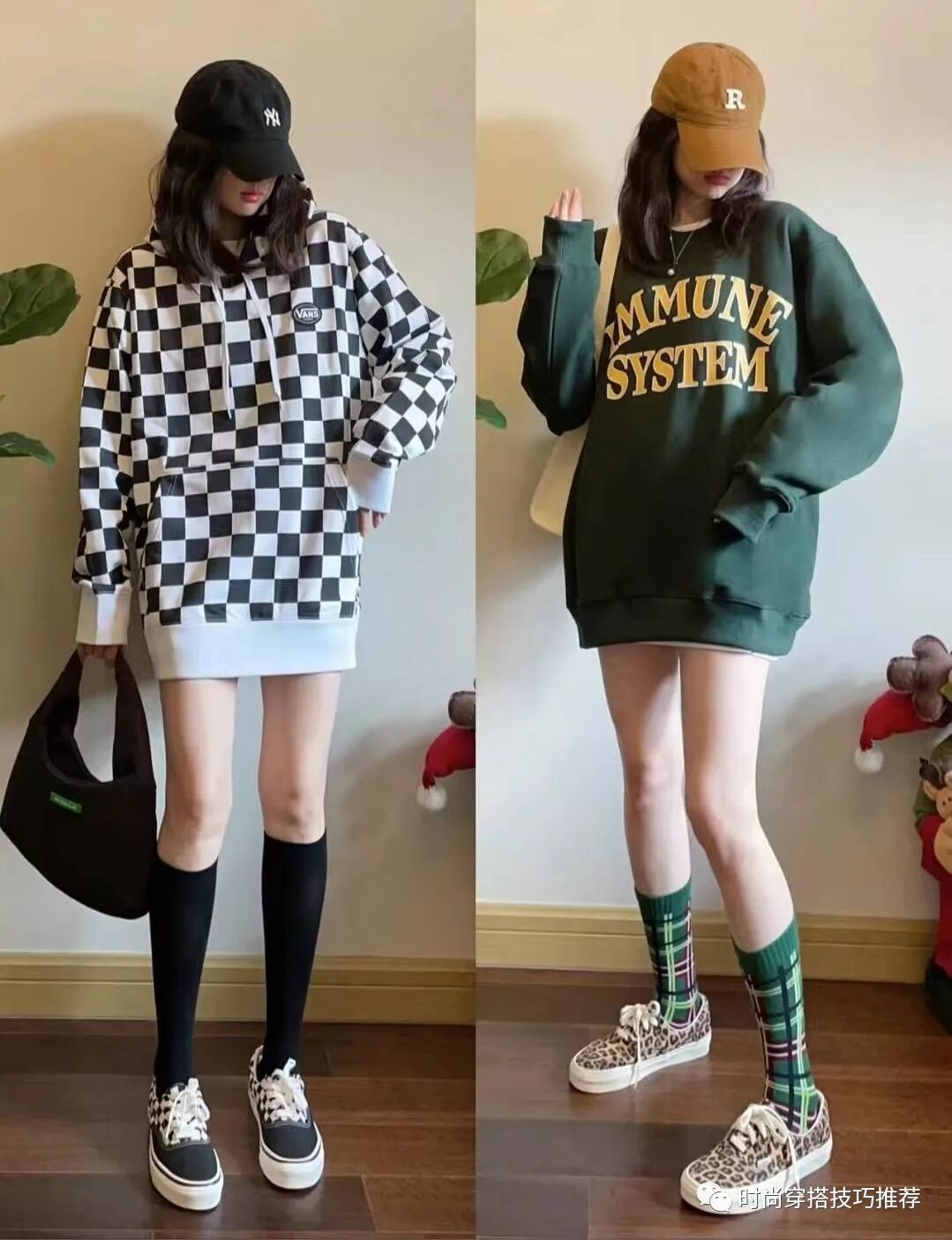 幂式穿搭2.0:黑白棋盘格卫衣和深绿色卫衣都是适合春季的配色,宽松的版型非常适合演绎下身失踪穿法,有亮点又韩系,搭配小腿袜出街回头率爆表。