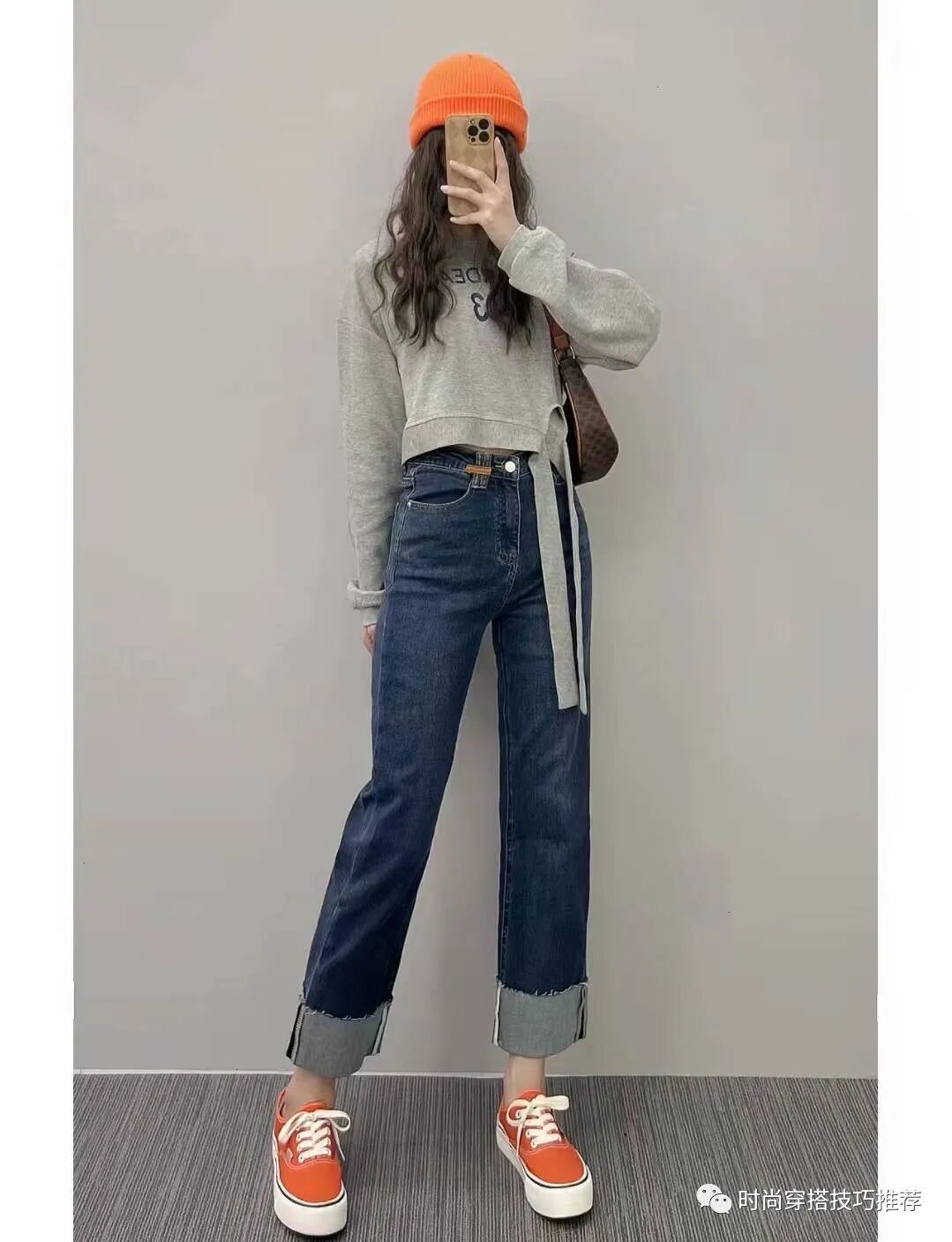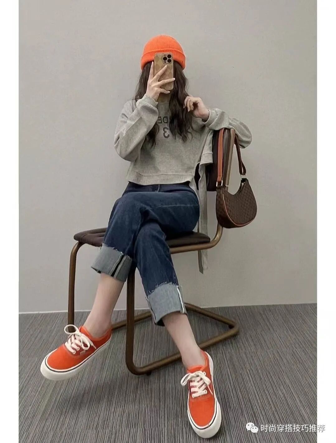 灰色印花圆领绑带短款卫衣+蓝色翻边牛仔裤+橘色帆布鞋,这是青春无敌的不出错组合,可以说是减龄神器了,一顶针织帽呼应鞋子,时尚调皮感UP。