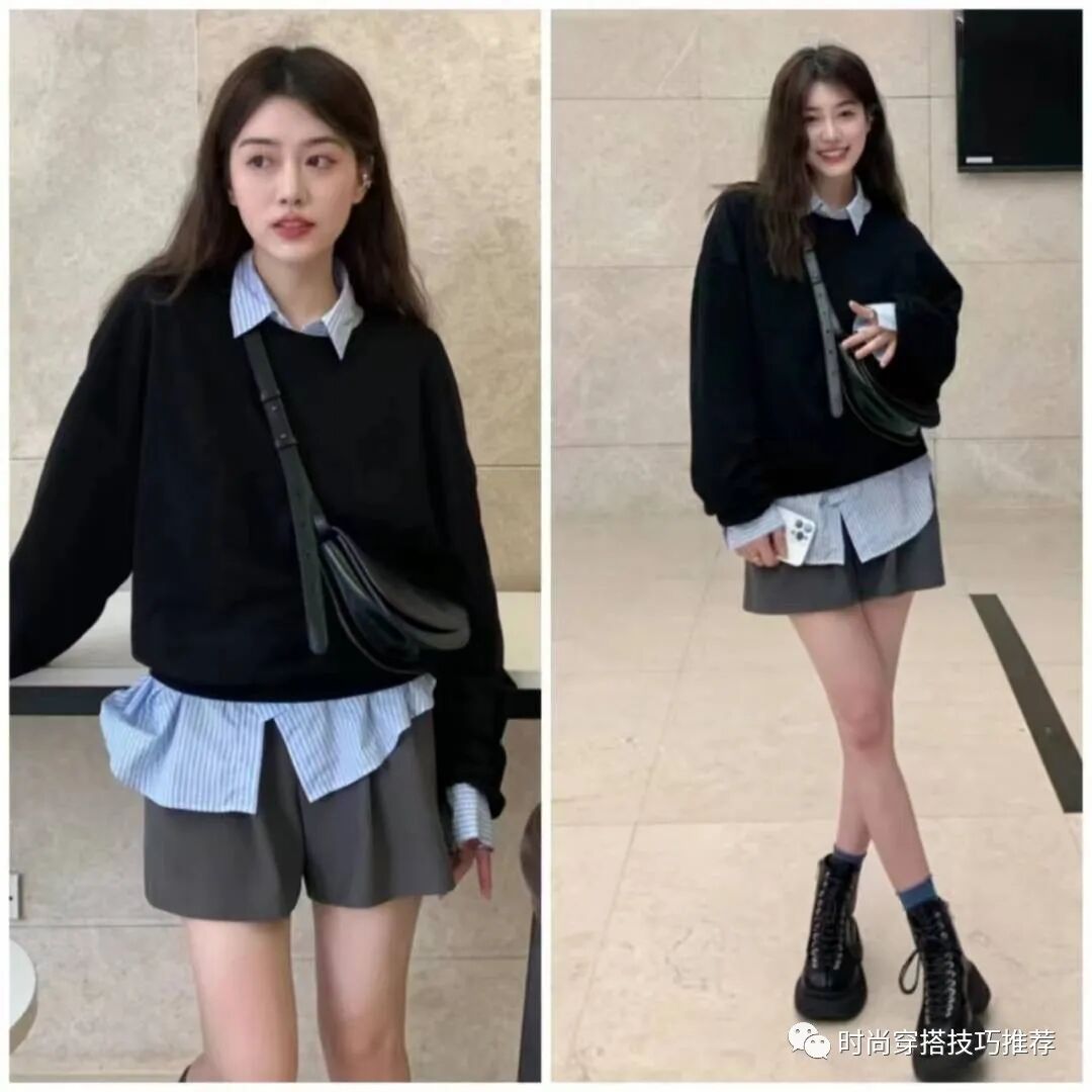 黑色卫衣这么穿不沉闷,里面叠穿条纹衬衫时髦又洋气,下半身搭配灰色短裤和马丁靴,小个子春天这么穿时髦又显高。