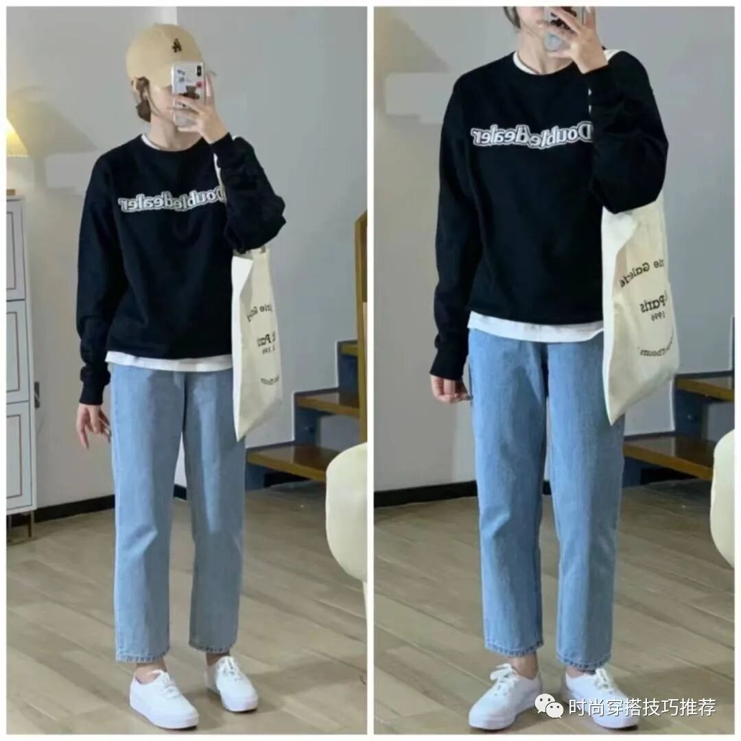 春天卫衣这样穿真的简单又好看!黑色卫衣和白t叠穿好韩,搭配白色帆布鞋和白t颜色呼应一下,浅色九分直筒牛仔裤是小个子显腿长的款式,一套慵懒随意感满满。