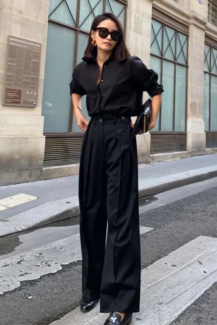 如果你想让阔腿裤更加温柔醒目,带有复古浪漫特色的法式衬衫无疑是绝佳的气质选择。上衣的温柔和下装的帅气相互中和,但更时尚时尚。