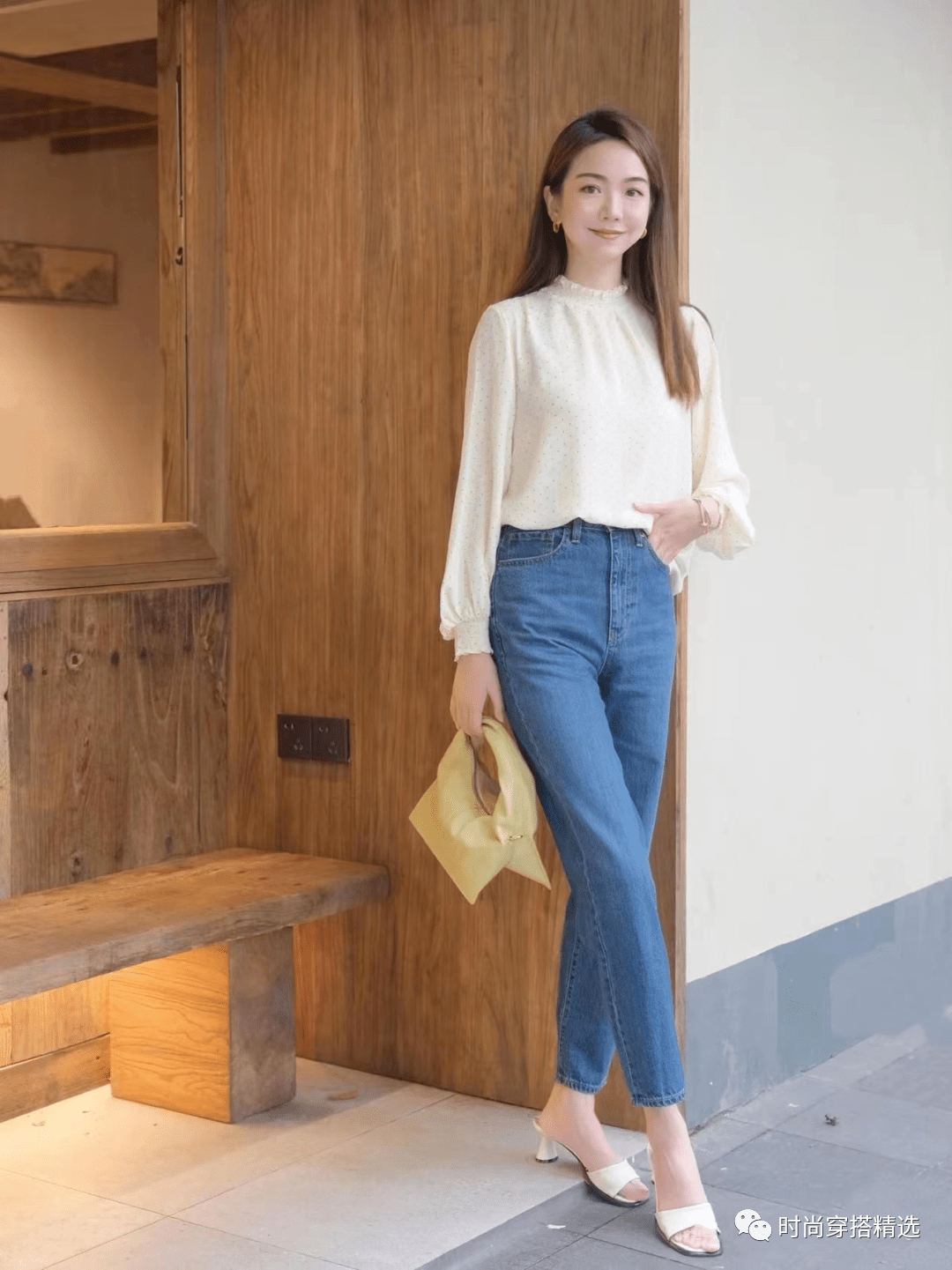 与衬衣搭配的牛仔拖地裤,反而给人一种轻松随意的感觉。