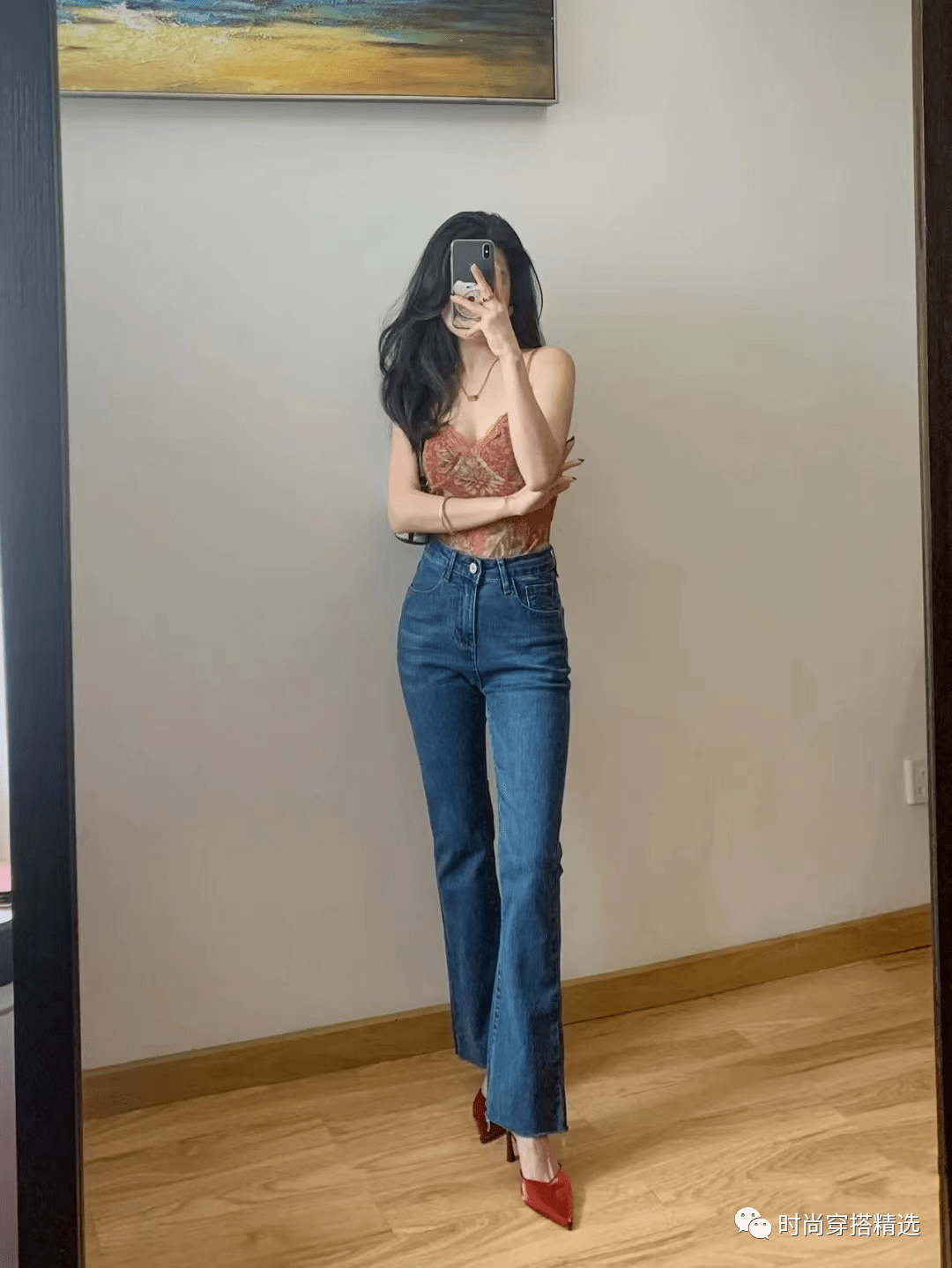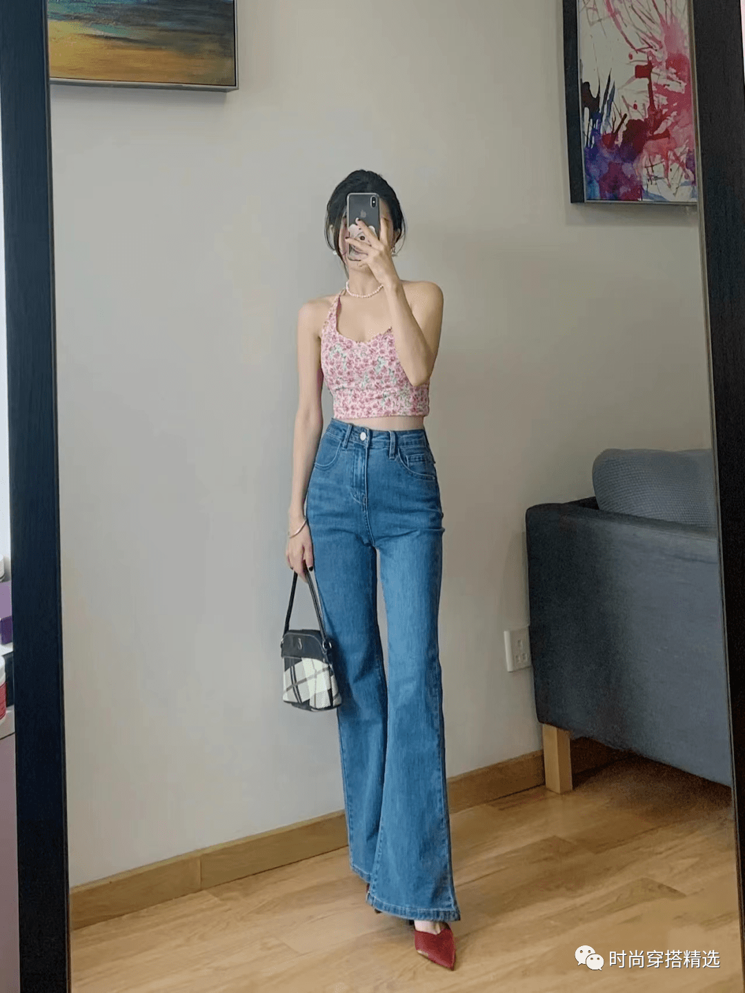 现在比较流行的微喇牛仔裤搭配各种吊带,既显时尚又有复古气息。
