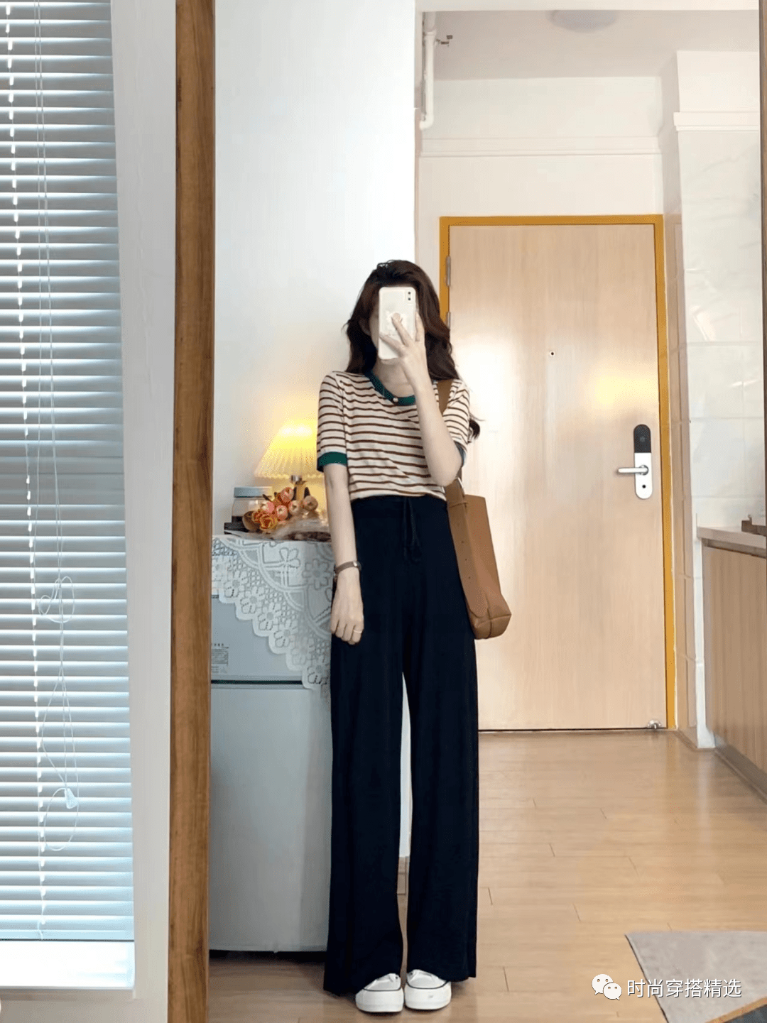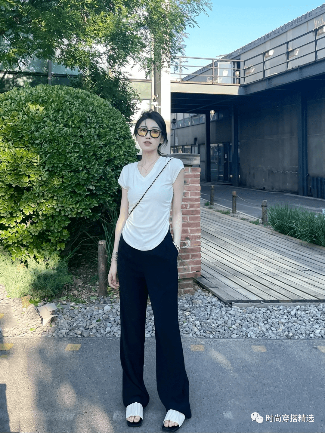 以下是牵地裤的简单搭配:可与白T恤搭配,简约纯粹,非常经典。