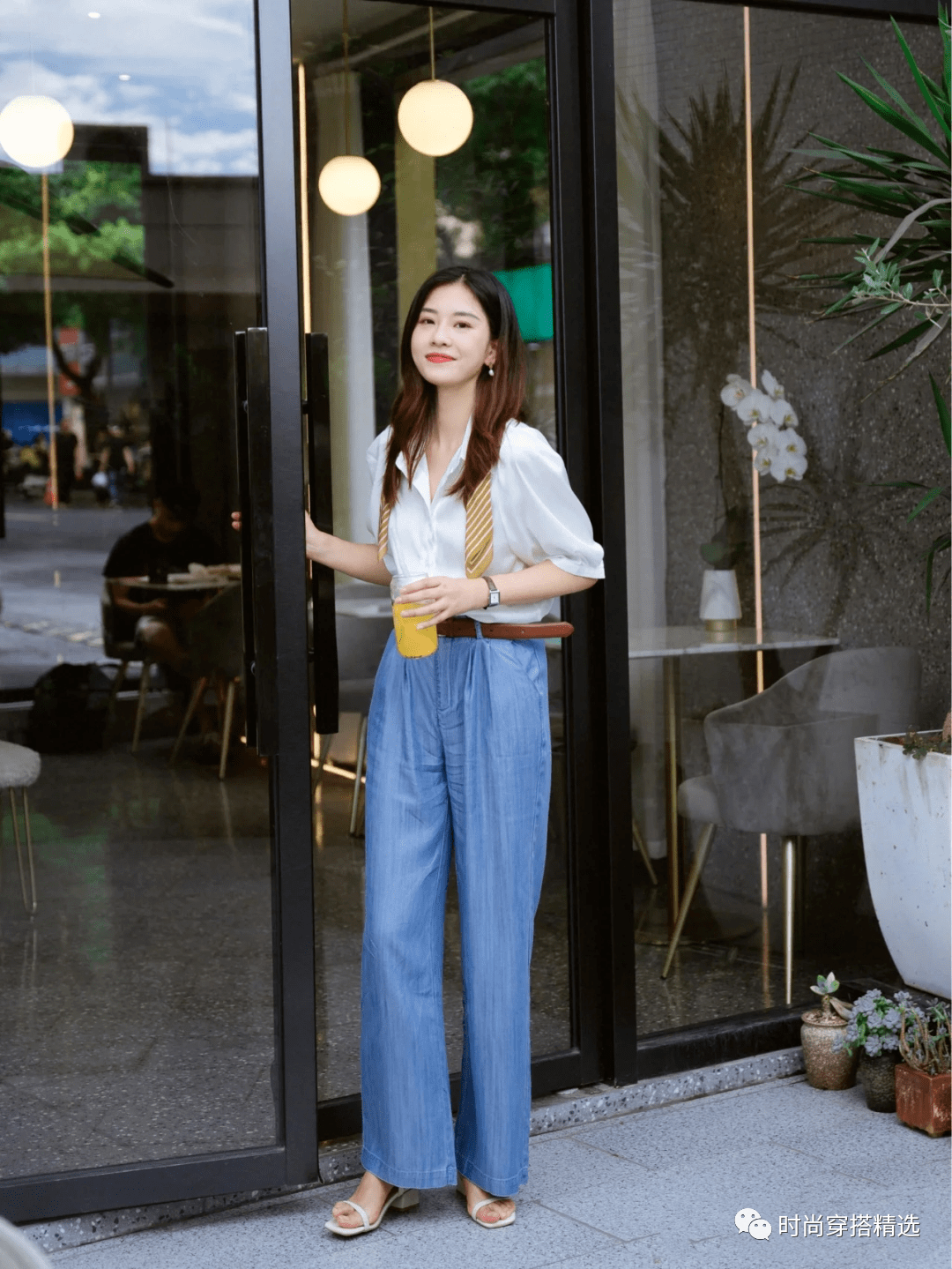 如果你是一个娇小的姐妹,在选择拖地裤的时候,你应该倾向于穿高腰拖地裤,然后搭配一件露腹吊带衬衫。太神奇了。如果你的思想比较保守,也可以加一件外套或者防晒衣。