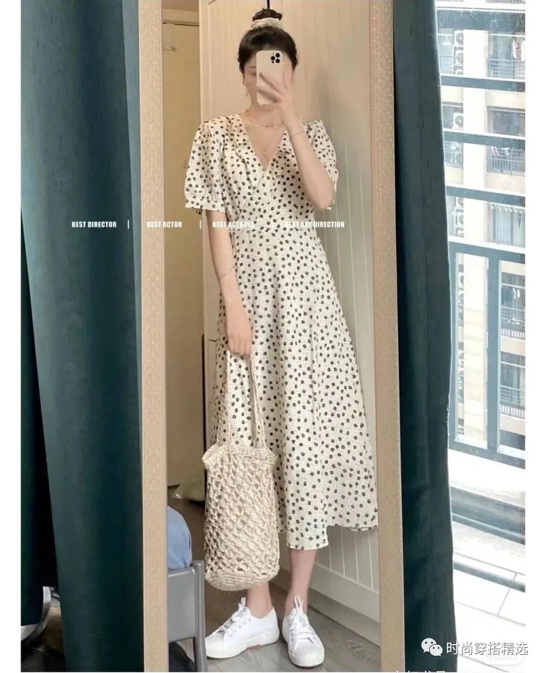黑色碎花连衣裙与小白鞋搭配也很好看,充满法式风格。