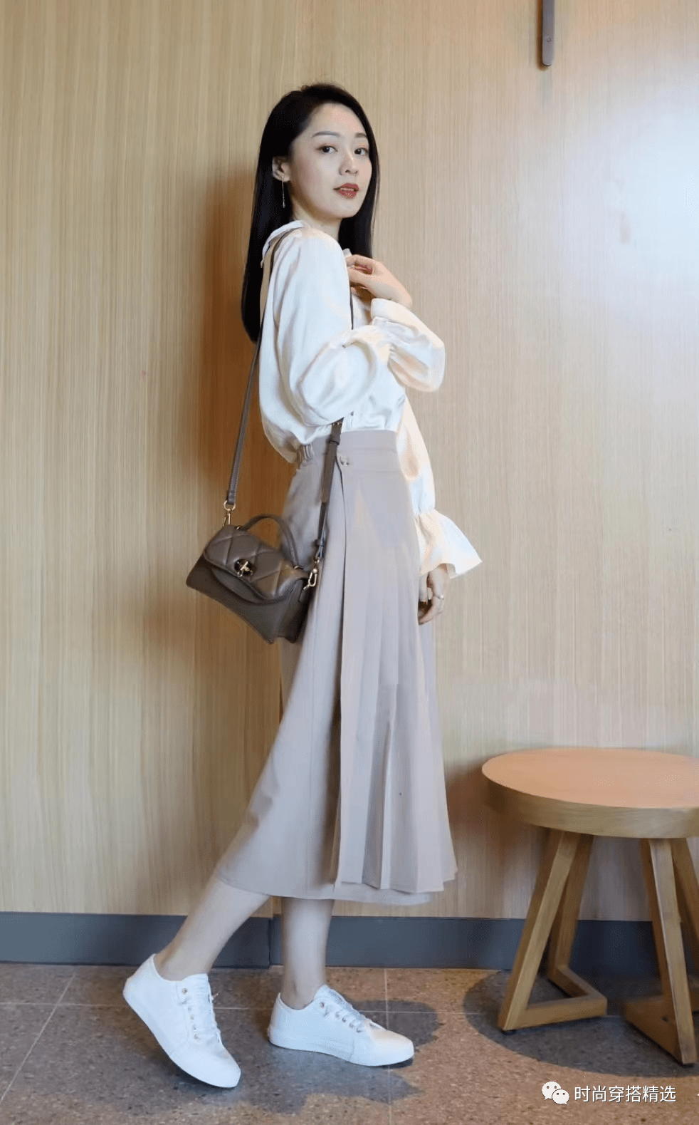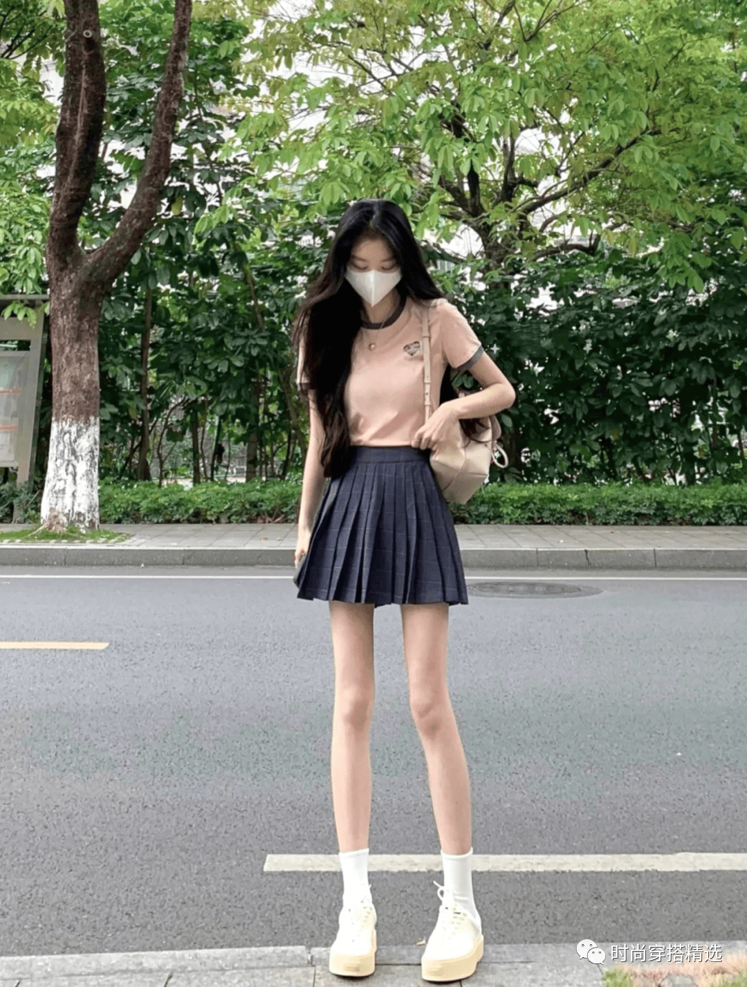 假如再加上褶皱设计,比如百褶裙配衬衣,造型更有层次感。