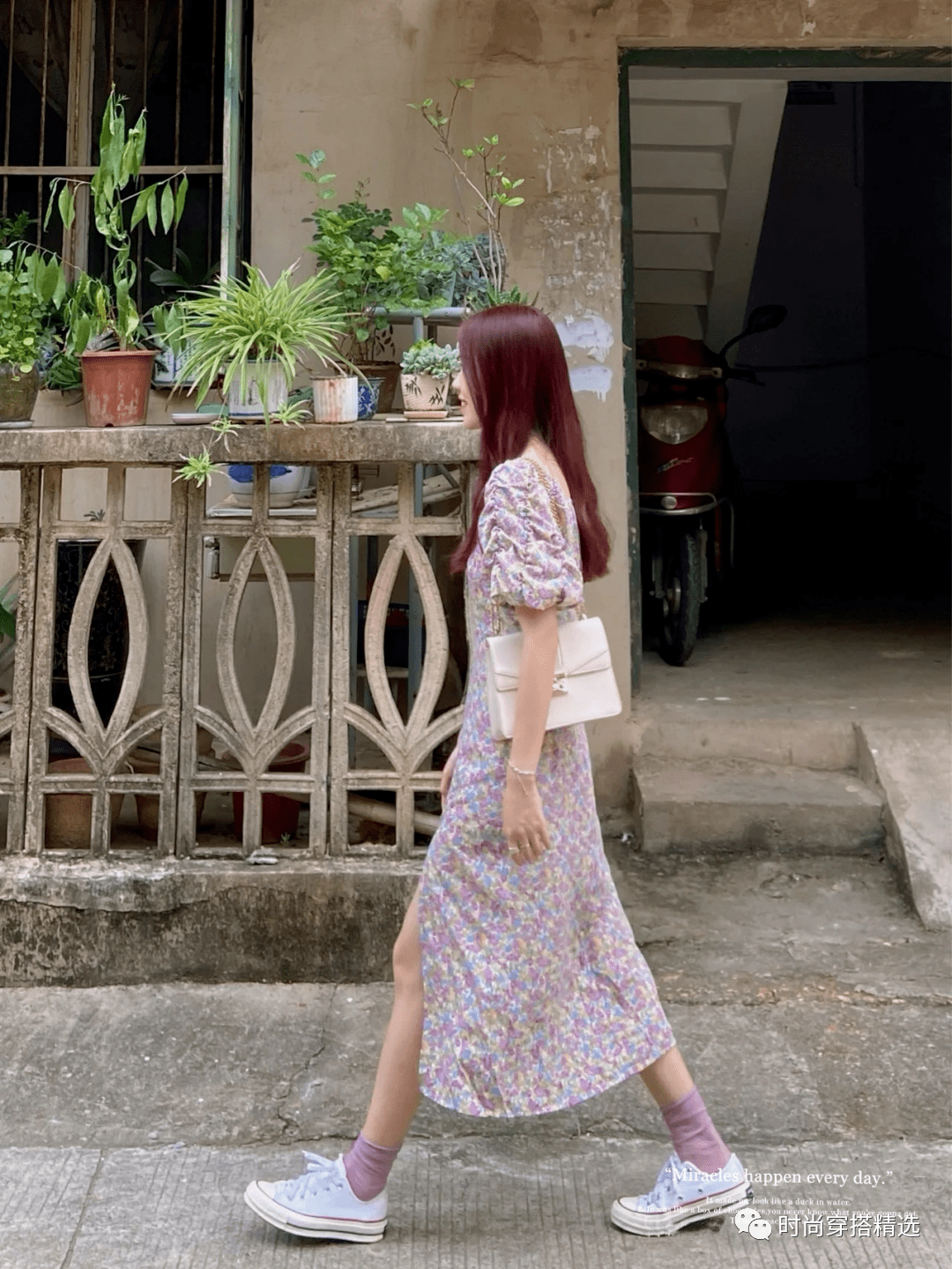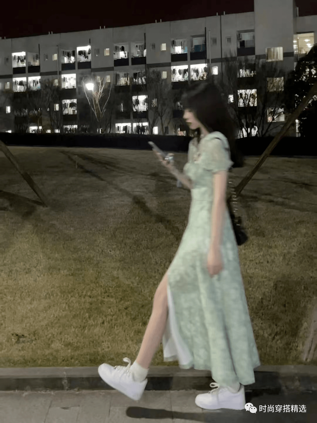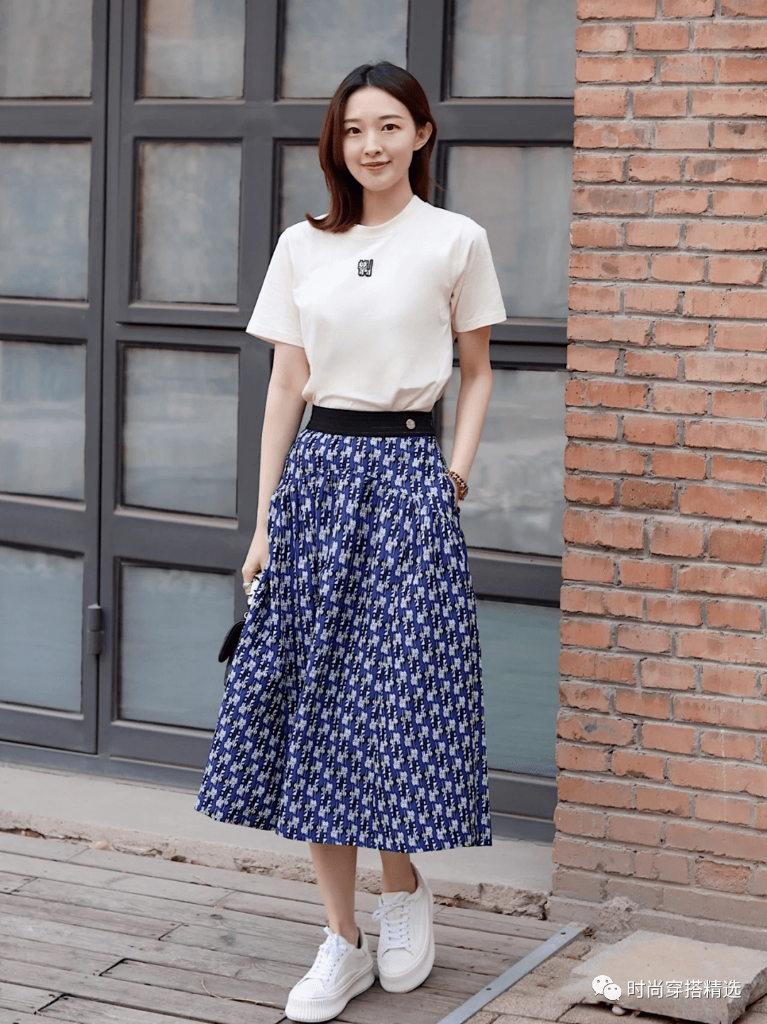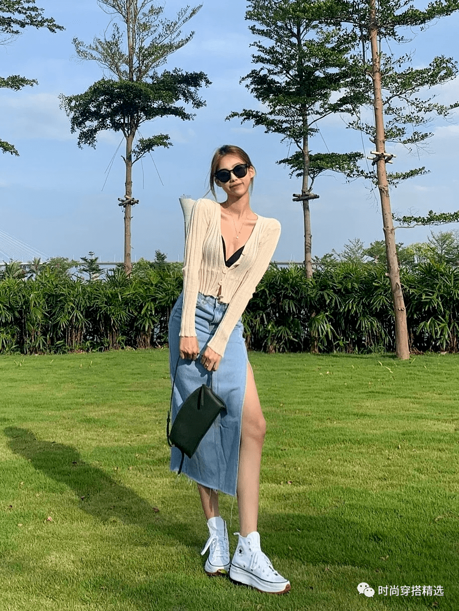 开叉裙既优雅又性感,与小白鞋休闲清新的风格似乎不相配。事实上,小白鞋确实是非常百搭的,可以适合各种款式的裙子。