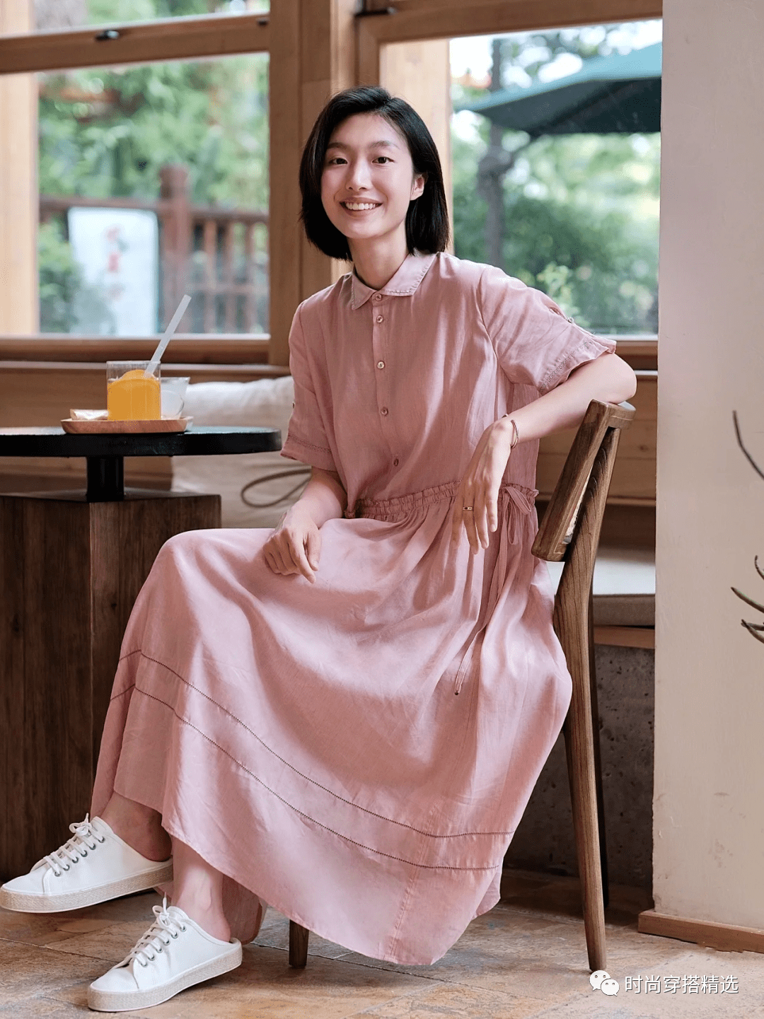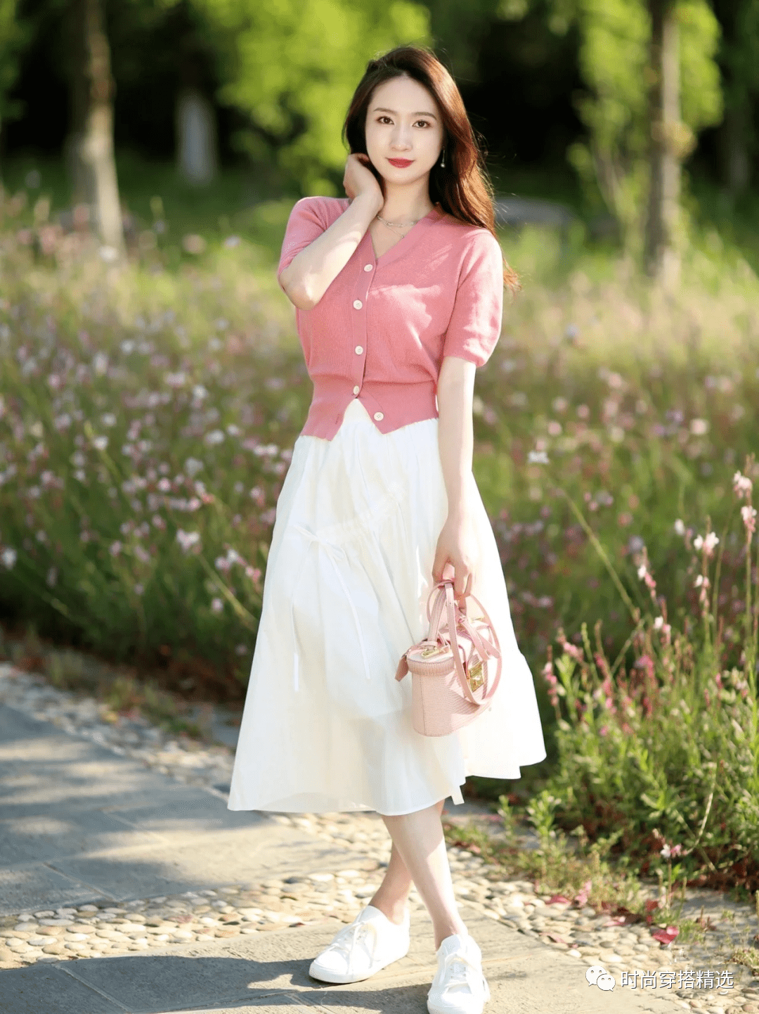粉红色的裙子配上一双小白鞋,给人一种清新文艺的感觉,就像日式风格。