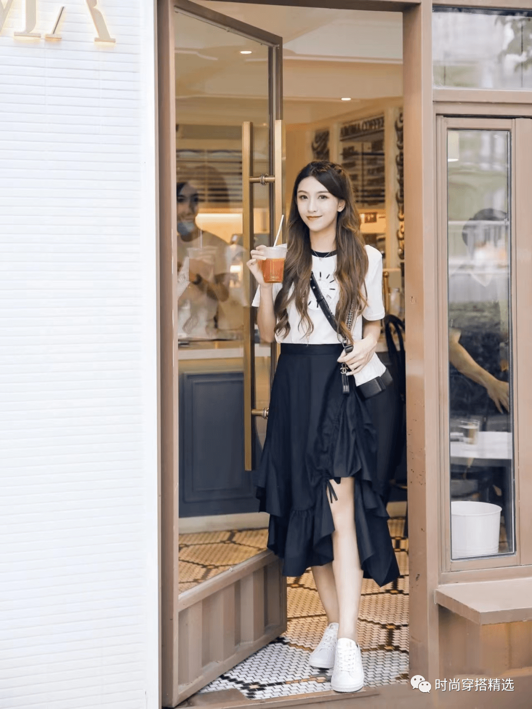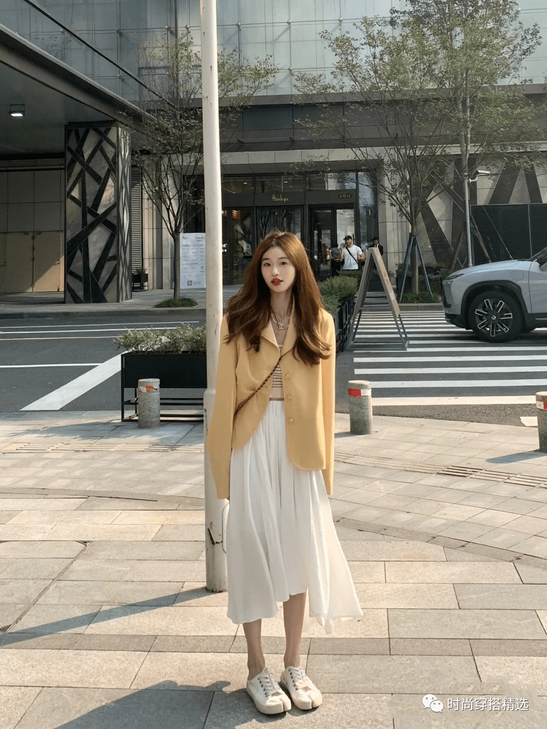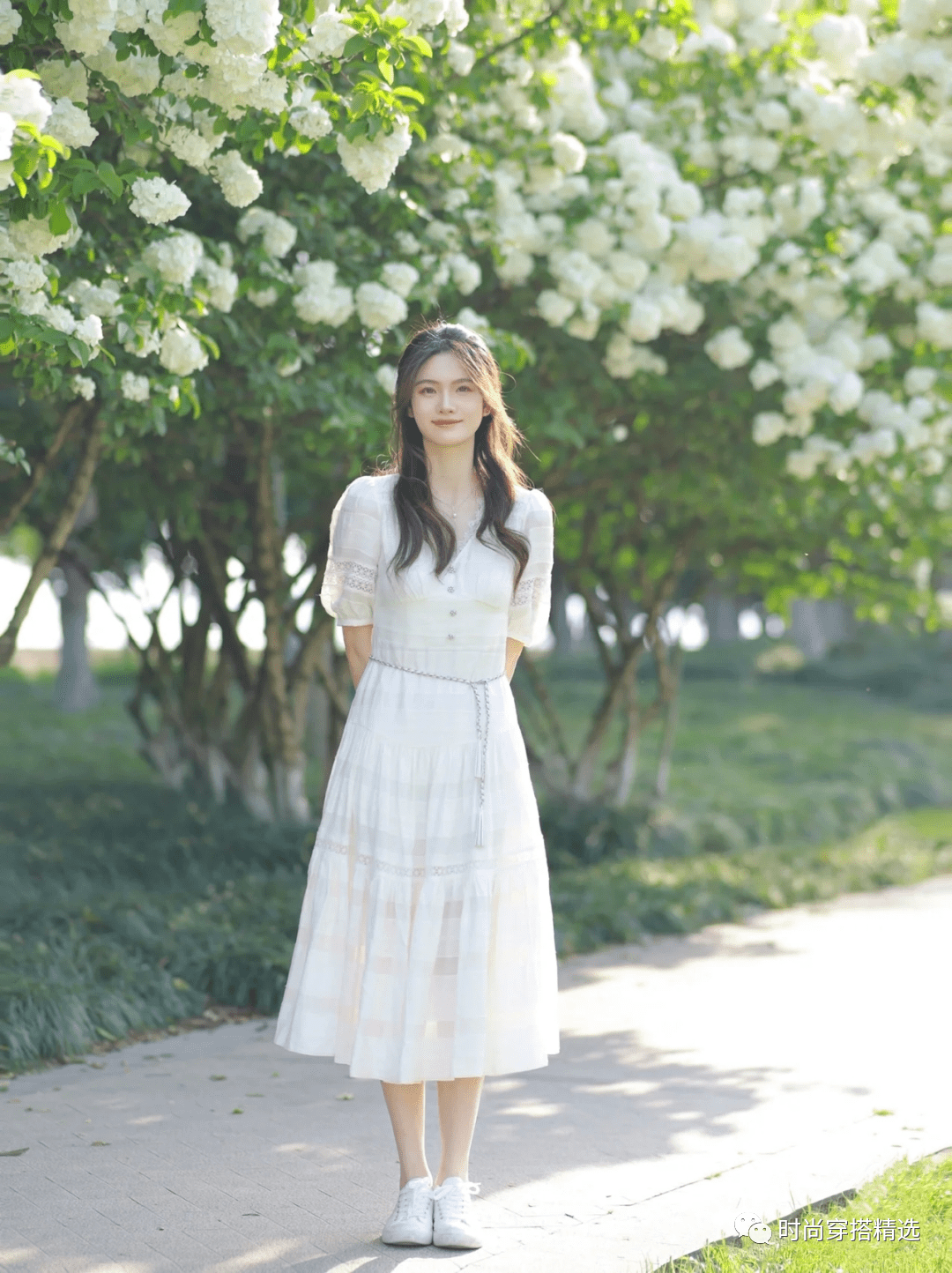 白裙配小白鞋,既有法式优雅的浪漫复古,又结合了意式的清新,十分感人。