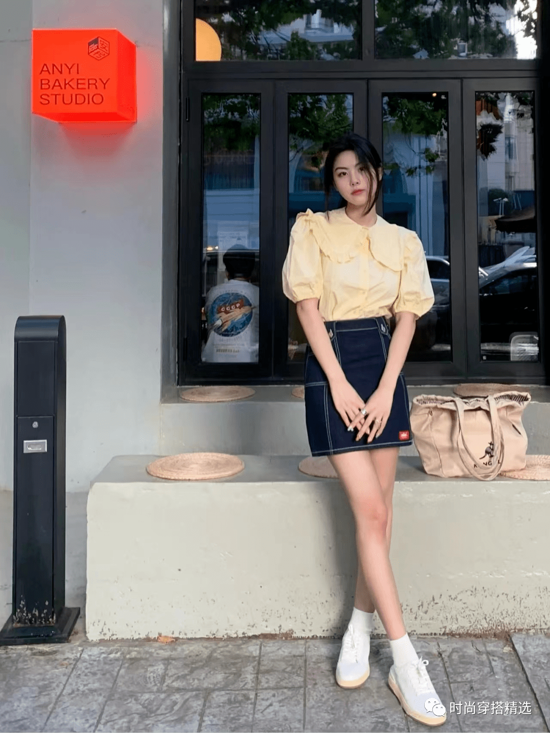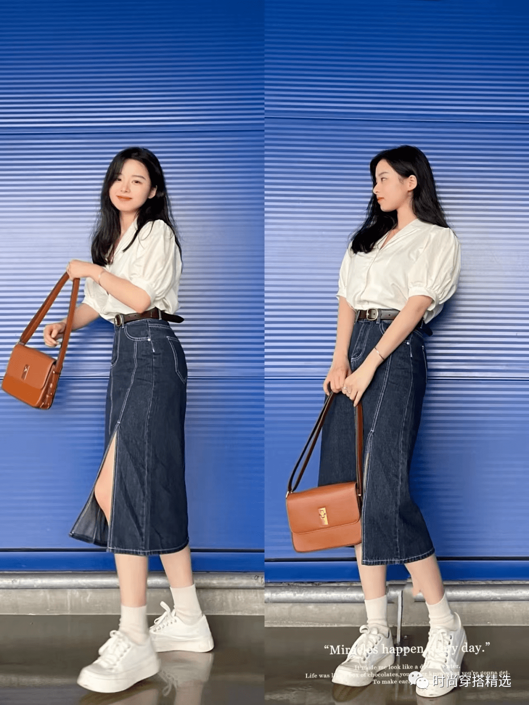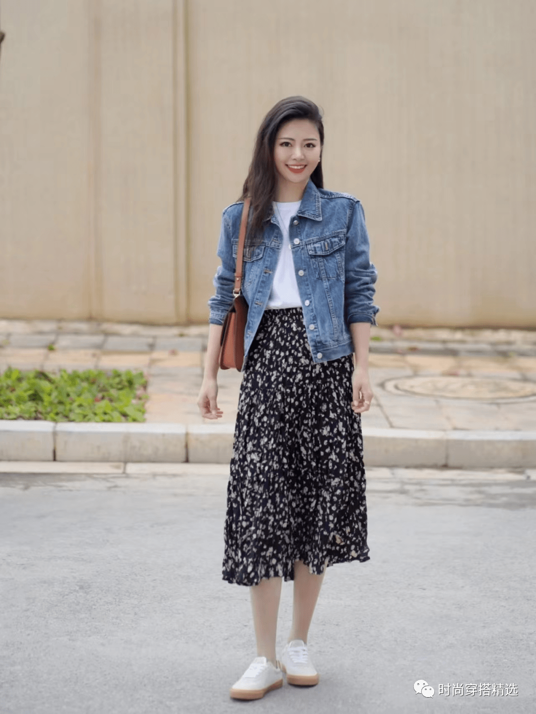 牛仔A字裙配小白鞋时非常经典的穿法,而且这组搭配对身材非常包容。