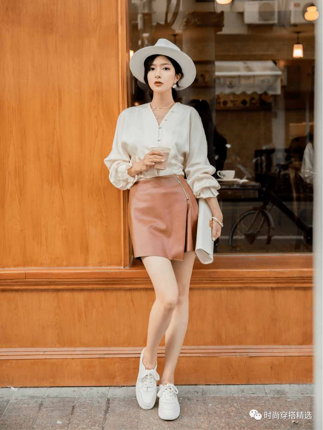 酷女孩喜欢穿A字皮裙和小白鞋搭配,看上去时髦又帅气。
