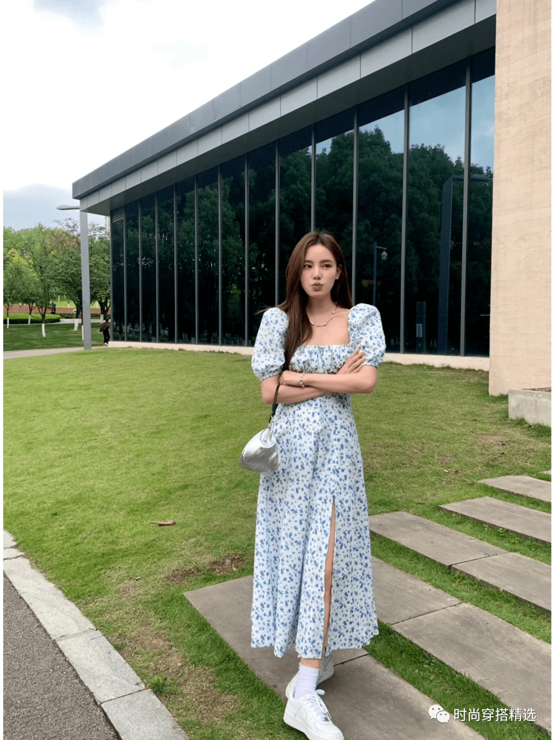 这款蓝白方领碎花开衩连衣裙,非常性感清凉,与小白鞋搭配也非常呼应。