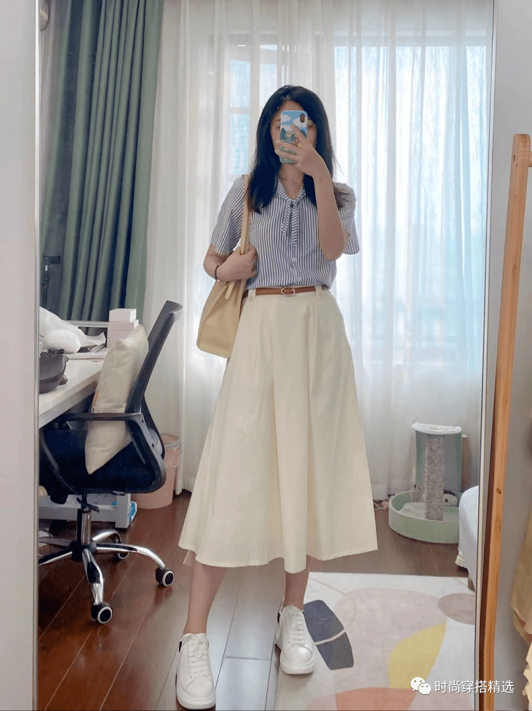 小白鞋与白色半裙,上衣配蓝色条纹短袖衬衣,适合夏季穿着上班啊。