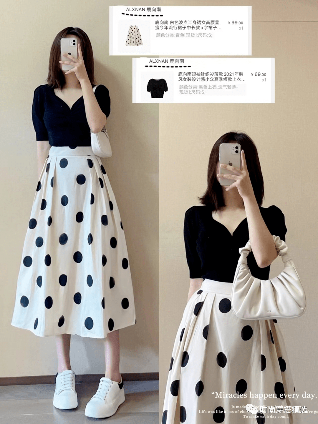 与黑白波点裙搭配的小白鞋,看上去甜美而温柔。波点裙和小白鞋不仅温柔甜美,而且非常优雅。