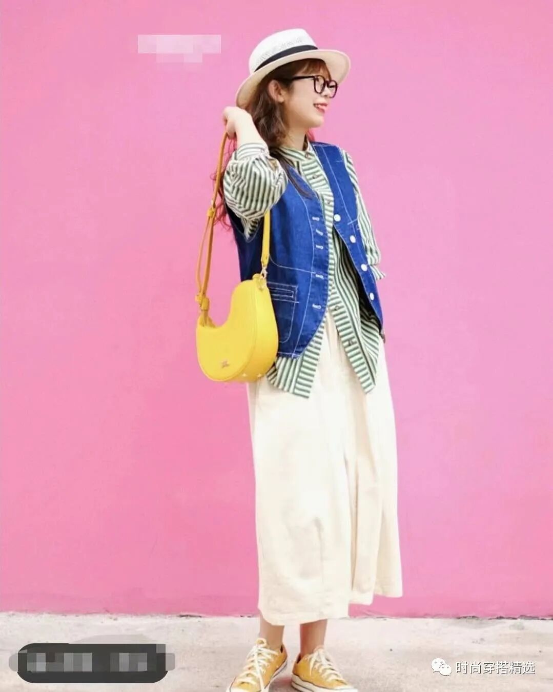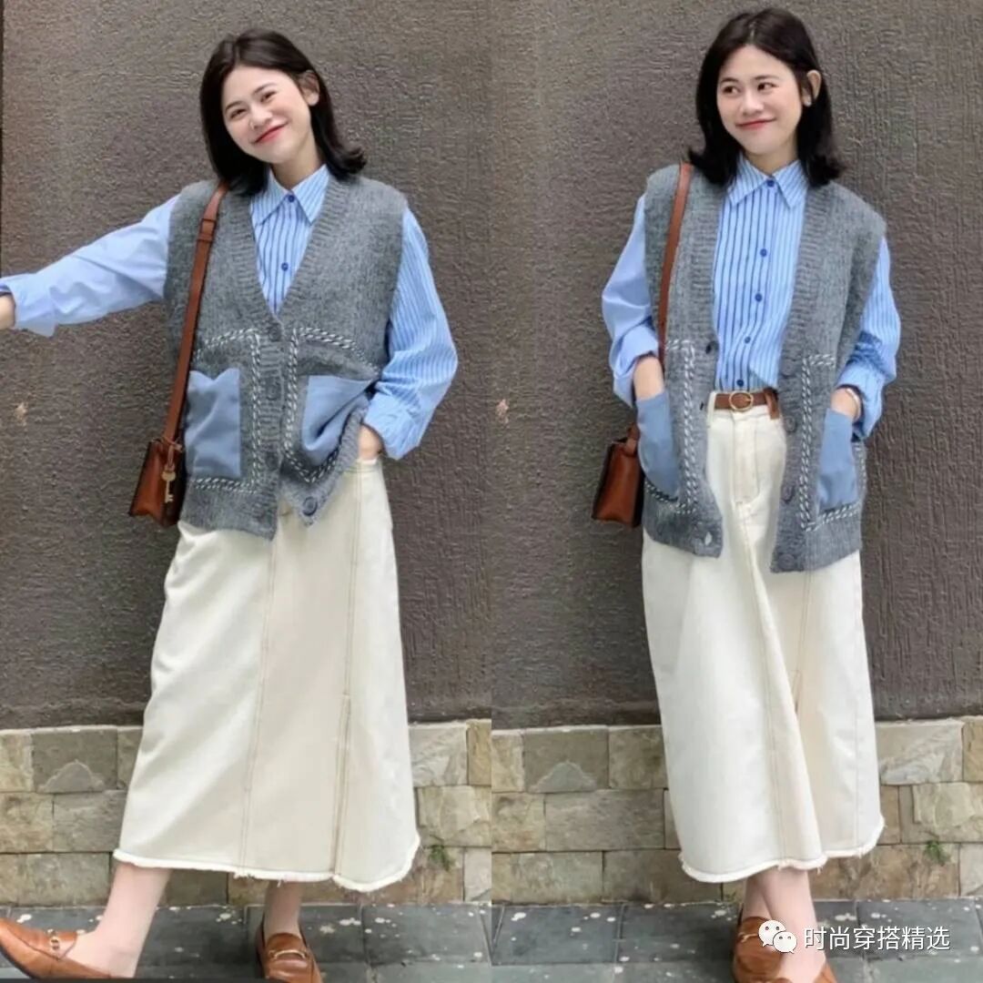 蓝灰配色针织马甲+蓝色条纹不对称衬衫+米白色牛仔半裙,就是很有学院风的一套,基础配色但又有设计感!这套可以是学校里的学姐,也可以是公司里的职场人士,大方得体又有层次感!