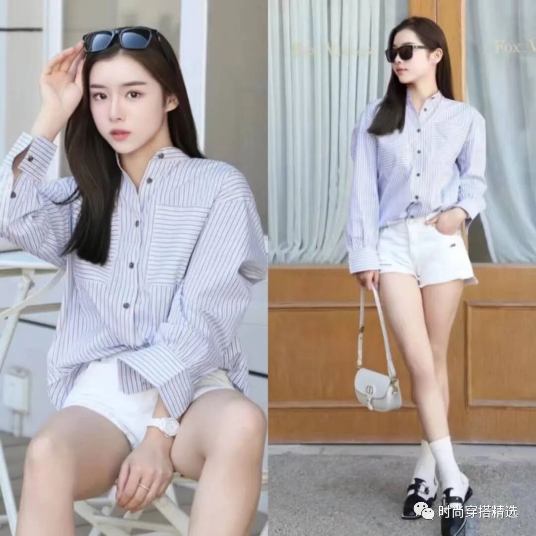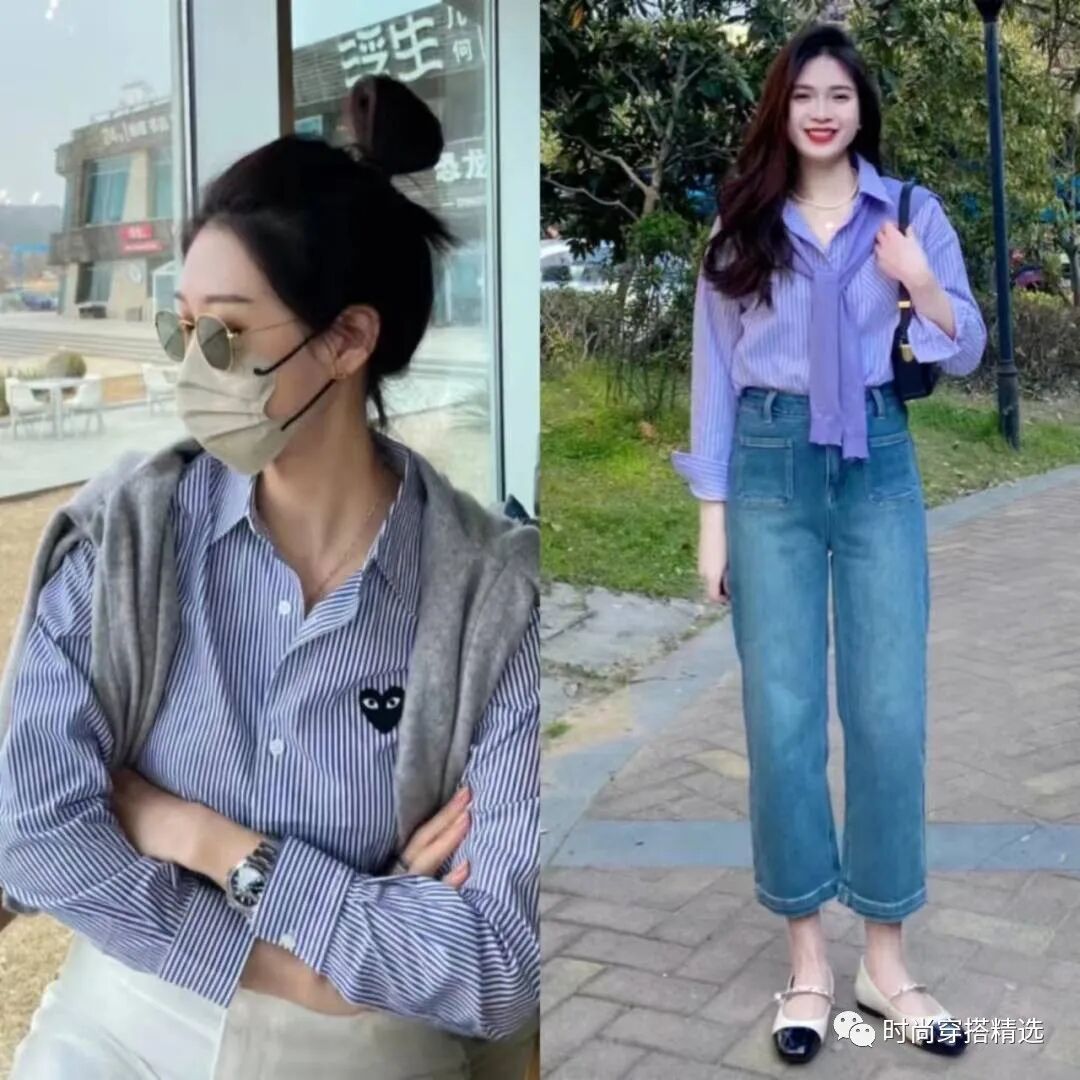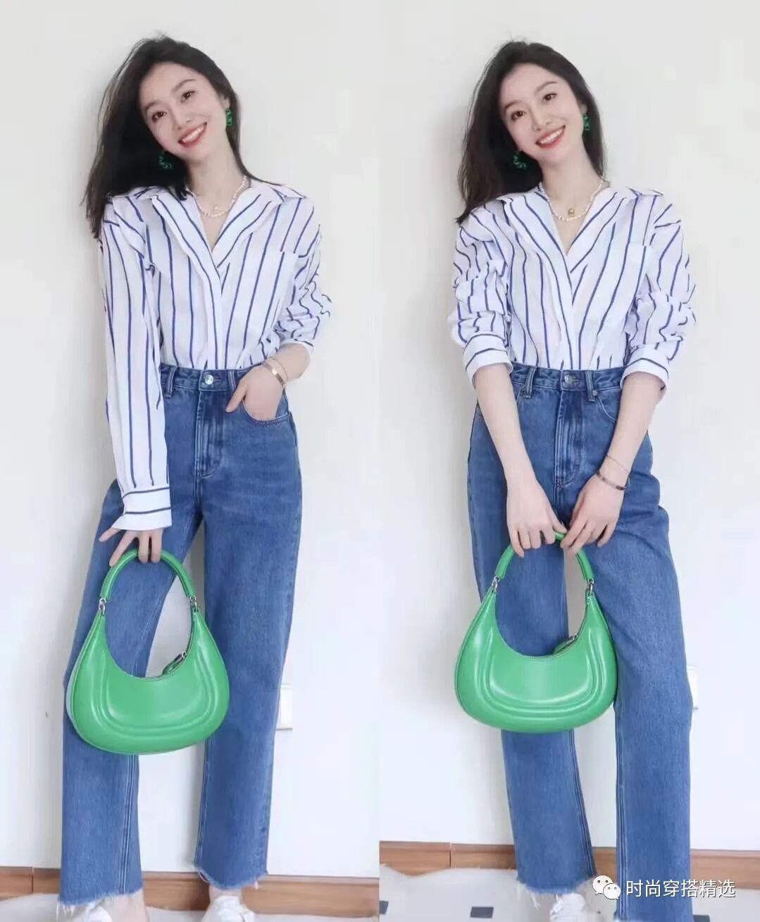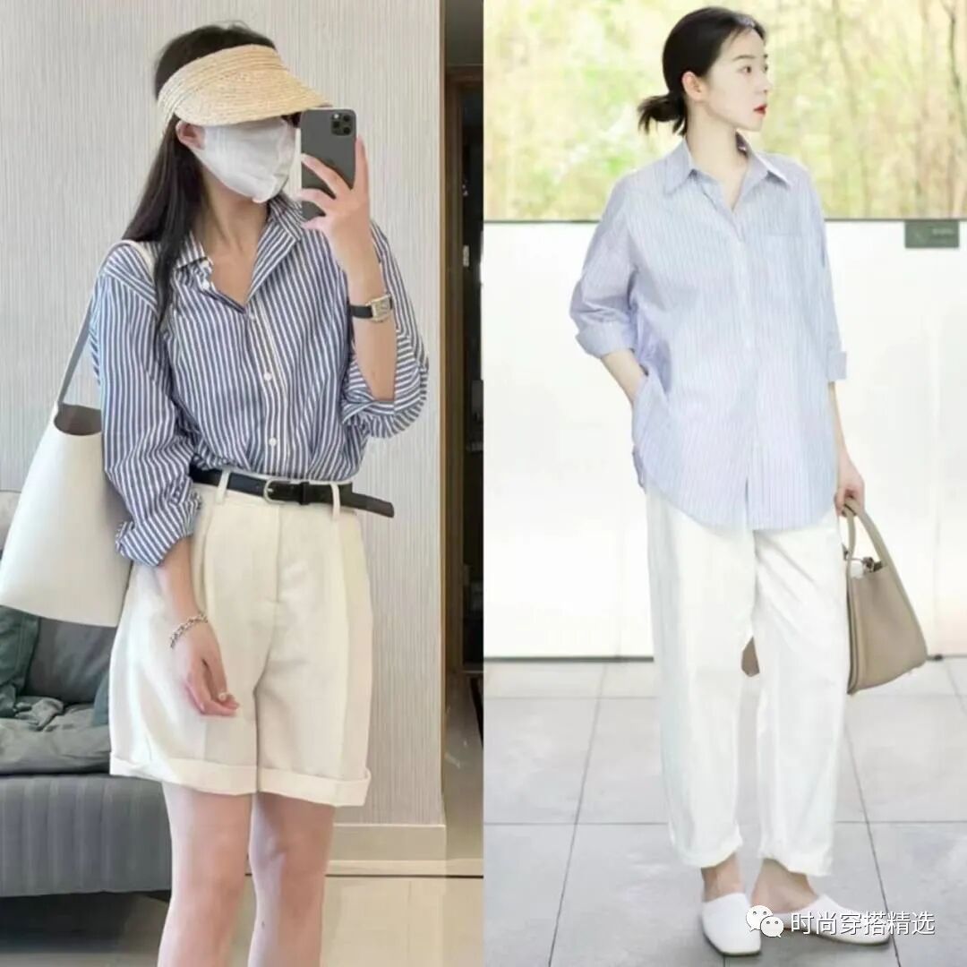 蓝白条纹衬衫最经典,也是上身率最高的单品,百搭好穿又不出错,日常通勤都可。