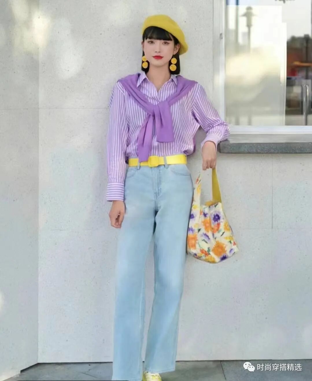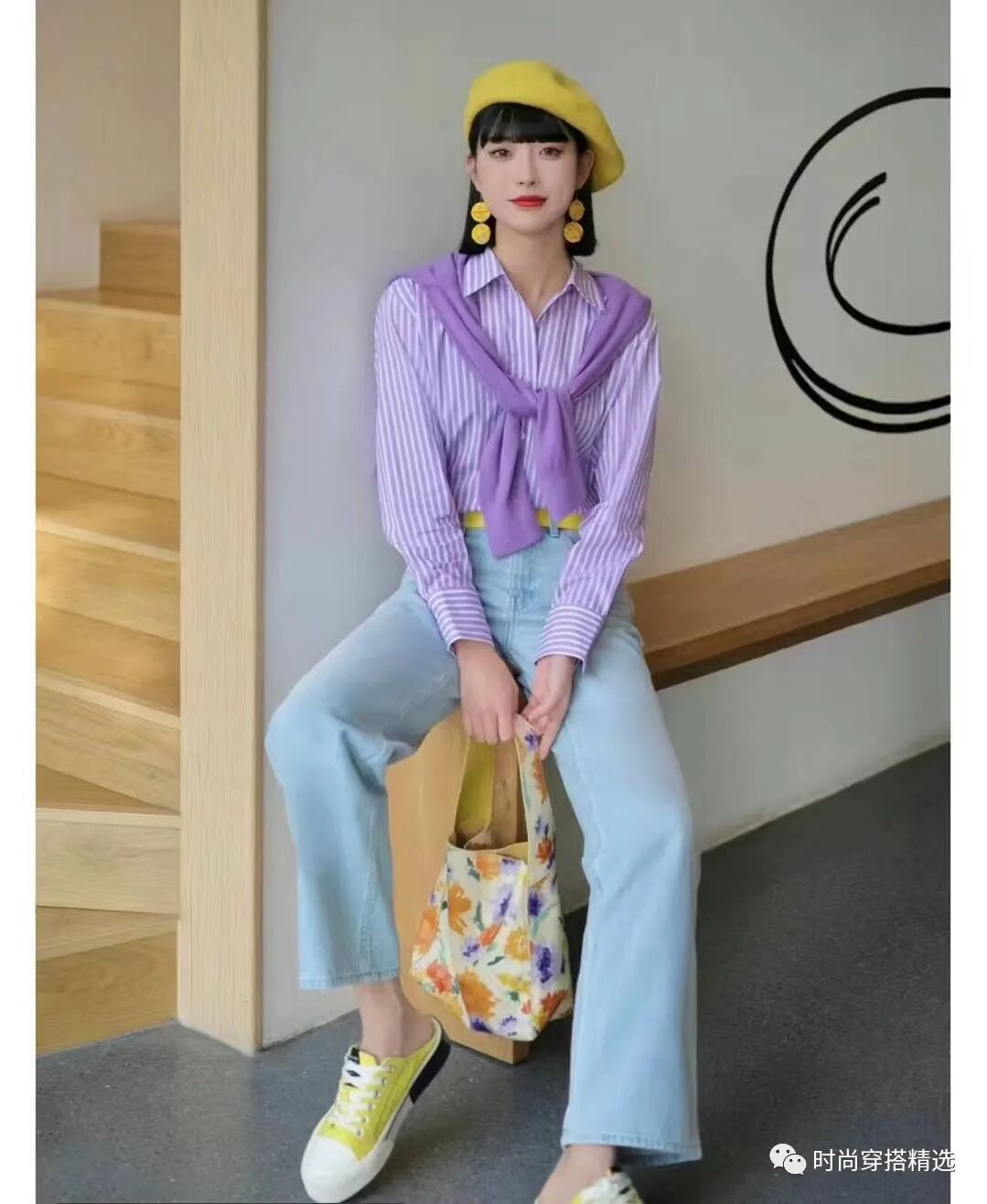清爽的紫色条纹衬衫元气又减龄、搭配浅色牛仔裤,同色系的软糯针织开衫做披肩增加层次感,复古又清爽活力。加上一条亮色腰带,整个造型会更有层次感。