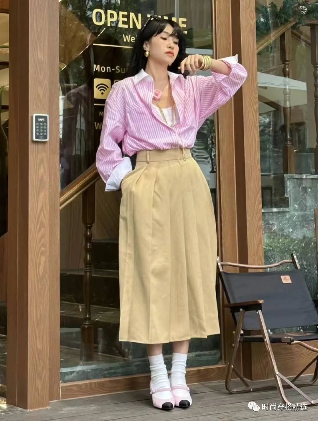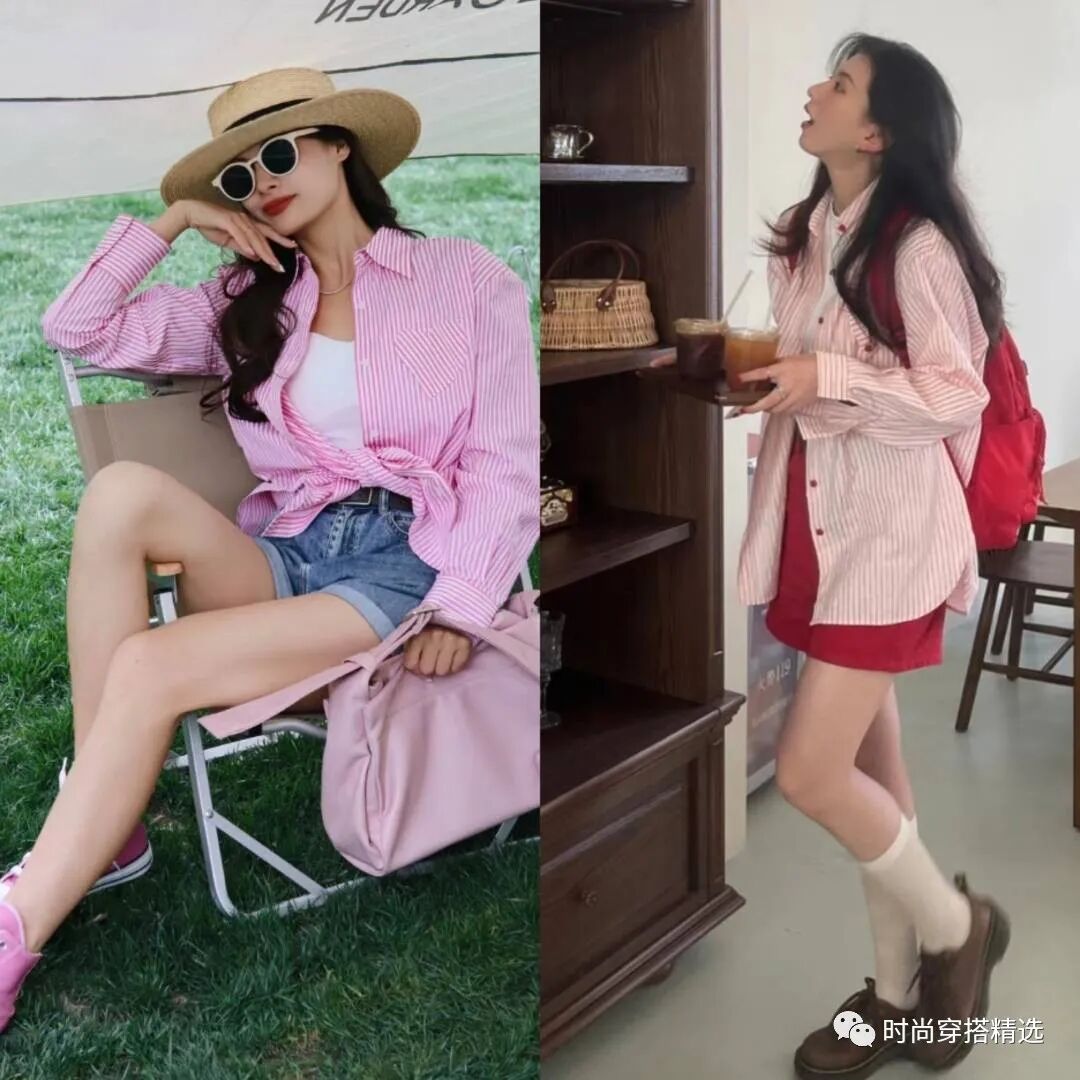 粉白条纹衬衫甜美减龄有少女感,我们不能选择太过于艳丽的粉色系,要选择淡粉色系的风格。